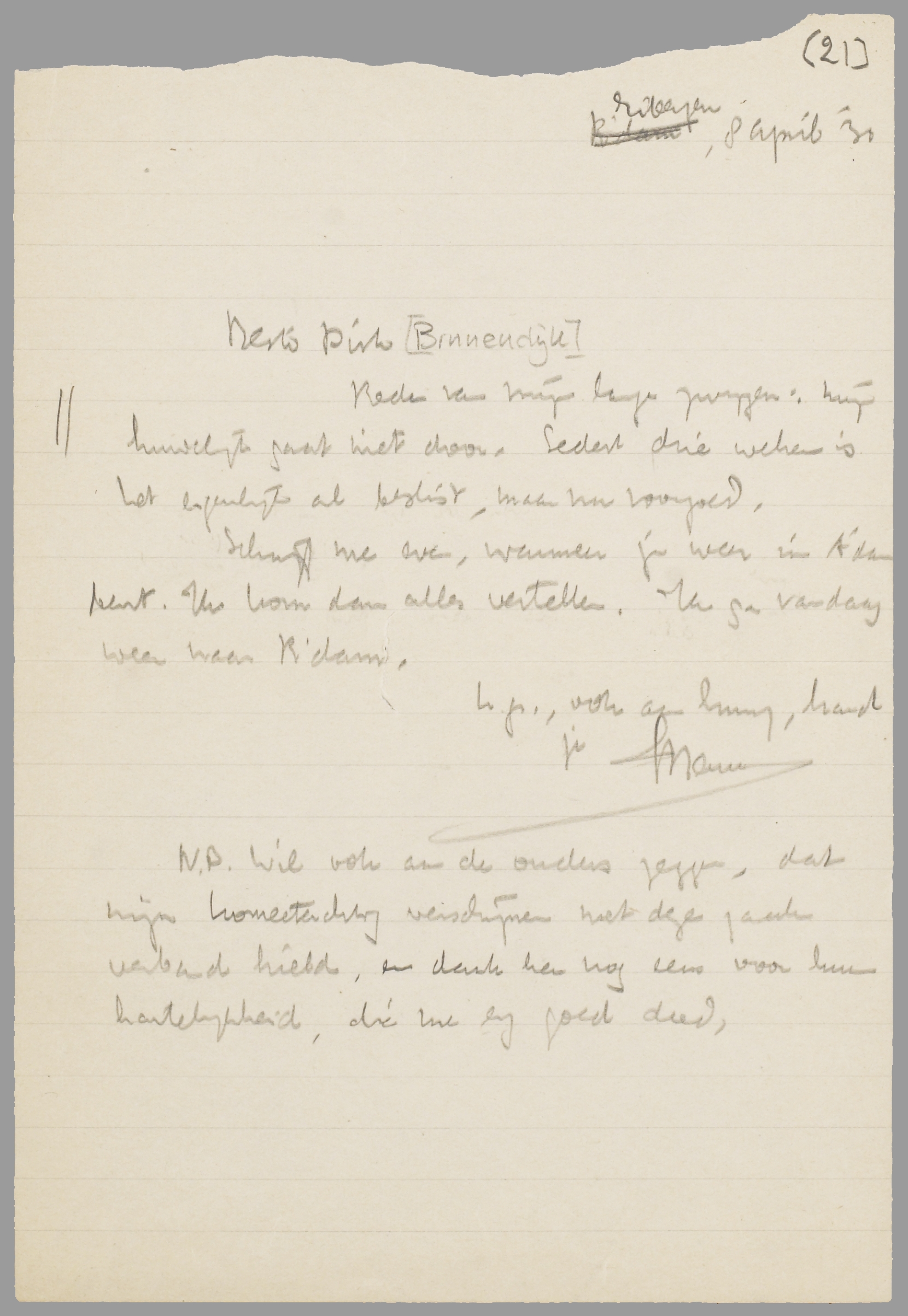 N.B. Wil ook aan je ouders zeggen, dat mijn komeetachtig verschijnen met deze zaak verband hield, en dank hen nog eens voor hun hartelijkheid, die me erg goed deed.