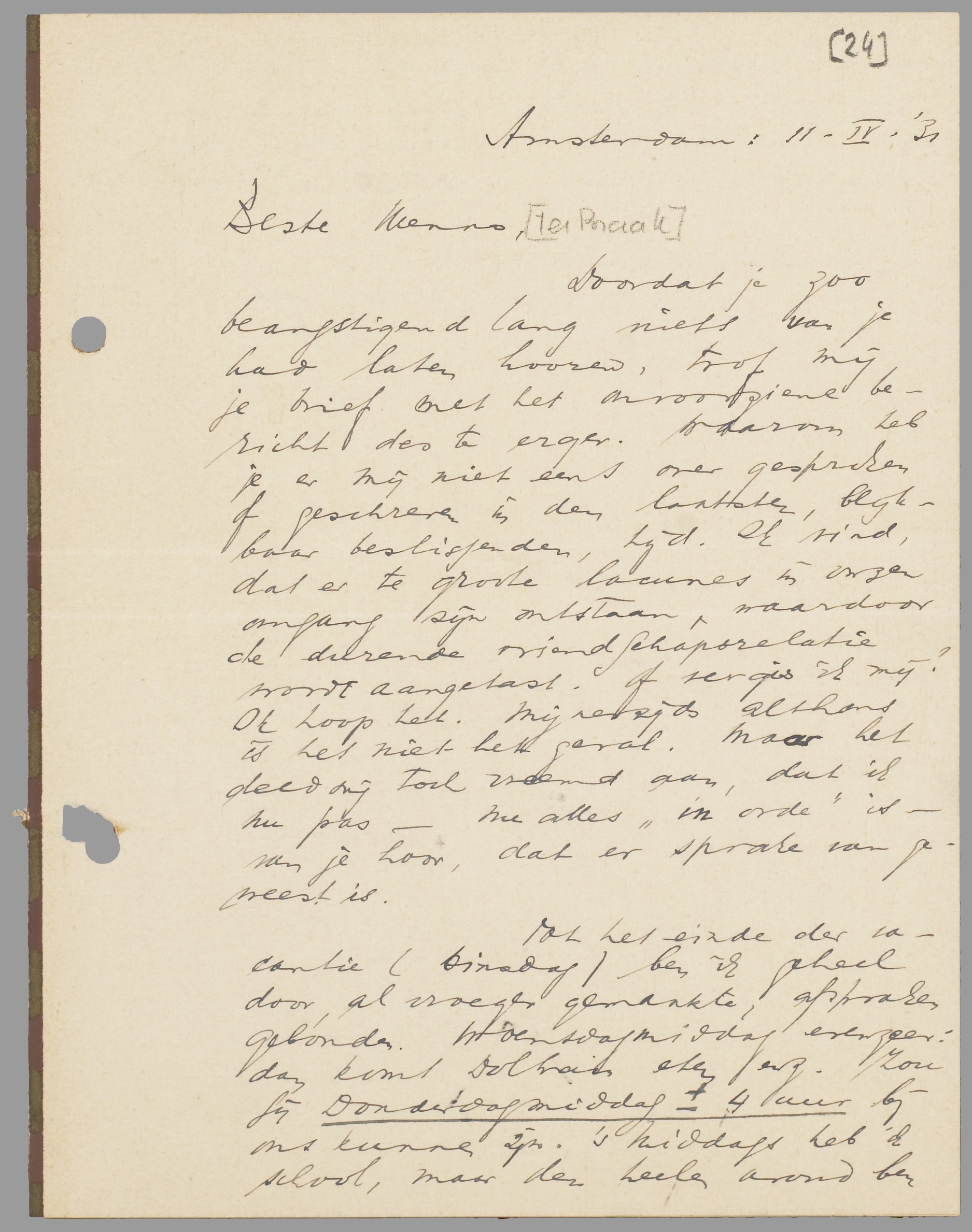 Doordat je zoo beangstigend lang niets van je had laten hooren, trof mij je brief met het onvoorziene bericht des te erger. Waarom heb je er mij niet eens over gesproken of geschreven in den laatsten, blijkbaar beslissenden, tijd. Ik vind, dat er te groote lacunes in onzen omgang zijn ontstaan, waardoor de durende vriendschapsrelatie wordt aangetast. Of vergis ik mij? Ik hoop het. Mijnerzijds althans is het niet het geval. Maar het deed mij toch vreemd aan, dat ik nu pas - nu alles ‘in orde’ is - van je hoor, dat er sprake van geweest is.