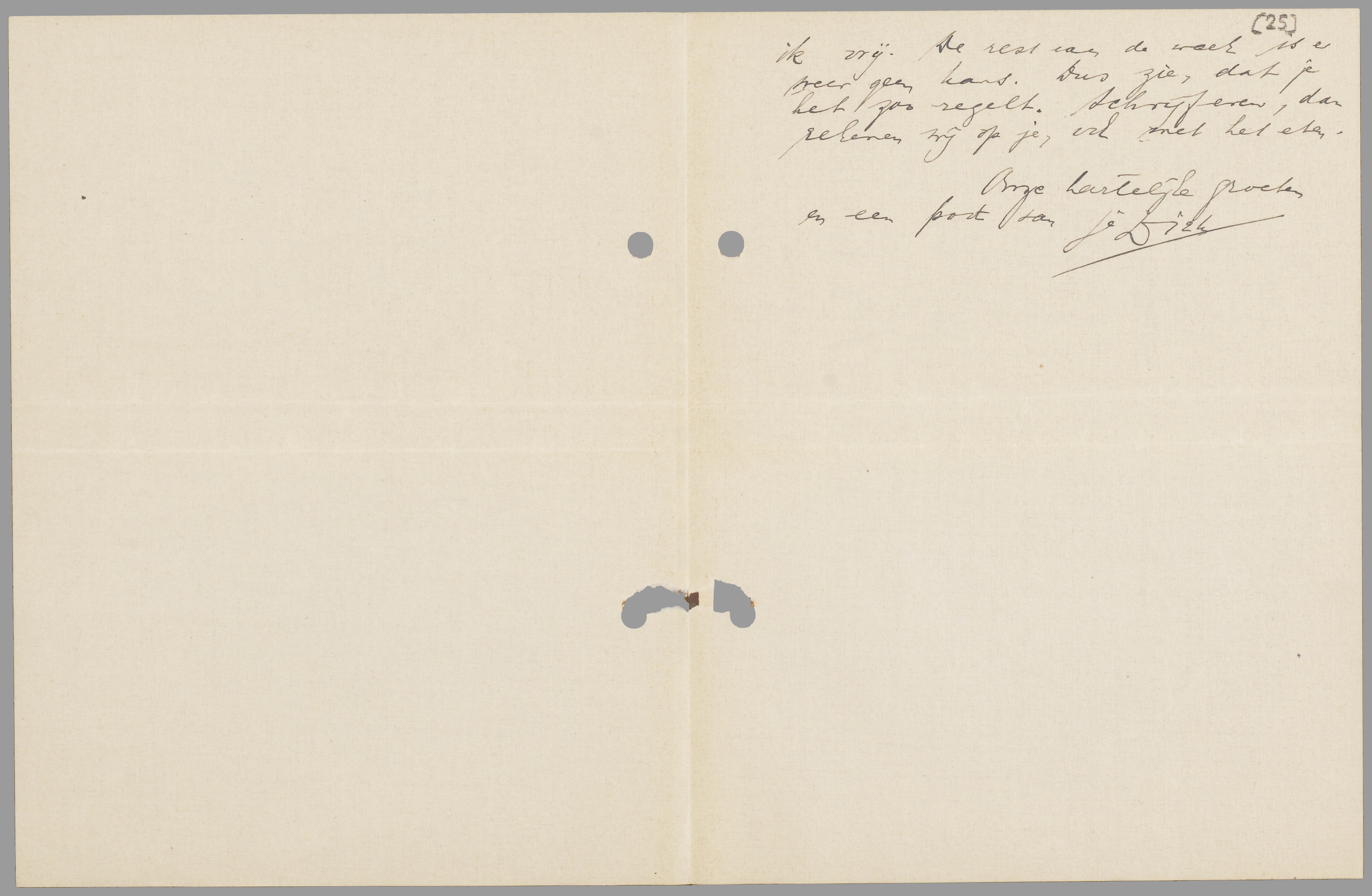 Tot het einde der vacantie (Dinsdag) ben ik geheel door, al vroeger gemaakte, afspraken gebonden. Woensdagmiddag evenzeer: dan komt Dolhain eten enz. Zou jij Donderdagmiddag ± 4 uur bij ons kunnen zijn. 's Middags heb ik school, maar den heelen avond ben ik vrij. De rest van de week is er weer geen kans. Dus zie, dat je het zoo regelt. Schrijf even, dan rekenen wij op je, ook met het eten.