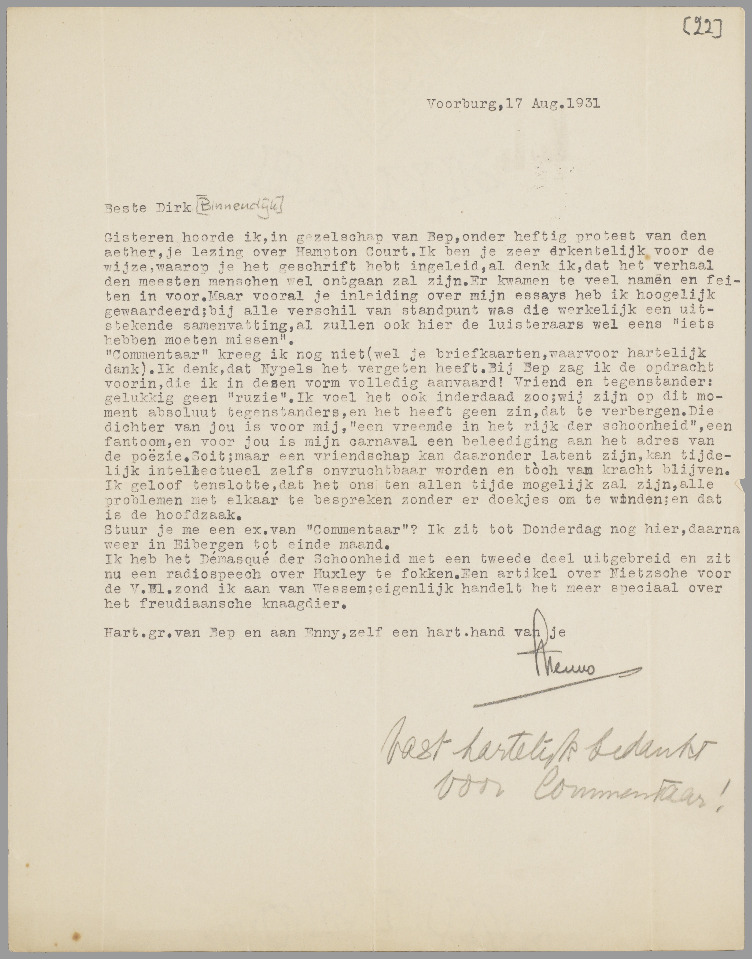 Gisteren hoorde ik, in gezelschap van Bep, onder heftig protest van den aether, je lezing over Hampton Court. Ik ben je zeer erkentelijk voor de wijze, waarop je het geschrift hebt ingeleid, al denk ik, dat het verhaal den meesten menschen wel ontgaan zal zijn. Er kwamen te veel namen en feiten in voor. Maar vooral je inleiding over mijn essays heb ik hoogelijk gewaardeerd; bij alle verschil van standpunt was die werkelijk een uitstekend samenvatting, al zullen ook hier de luisteraars wel eens ‘iets hebben moeten missen.’