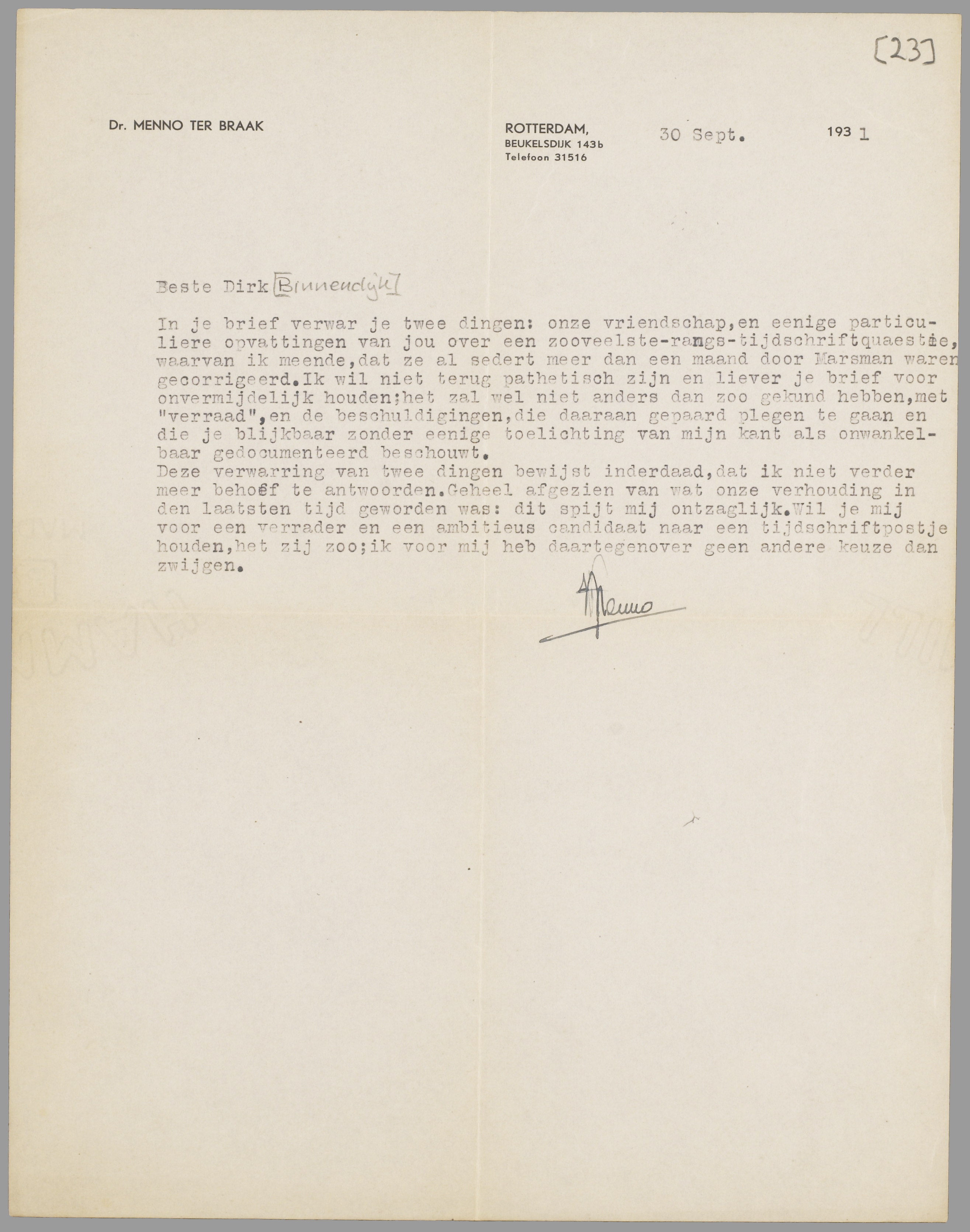 In je brief verwar je twee dingen: onze vriendschap, en eenige particuliere opvattingen van jou over een zooveelste-rangs-tijdschriftquaestie, waarvan ik meende, dat ze al sedert meer dan een maand door Marsman waren gecorrigeerd. Ik wil niet terug pathetisch zijn en liever je brief voor onvermijdelijk houden; het zal wel niet anders dan zoo gekund hebben, met ‘verraad’, en de beschuldigingen, die daaraan gepaard plegen te gaan en die je blijkbaar zonder eenige toelichting van mijn kant als onwankelbaar gedocumenteerd beschouwt.