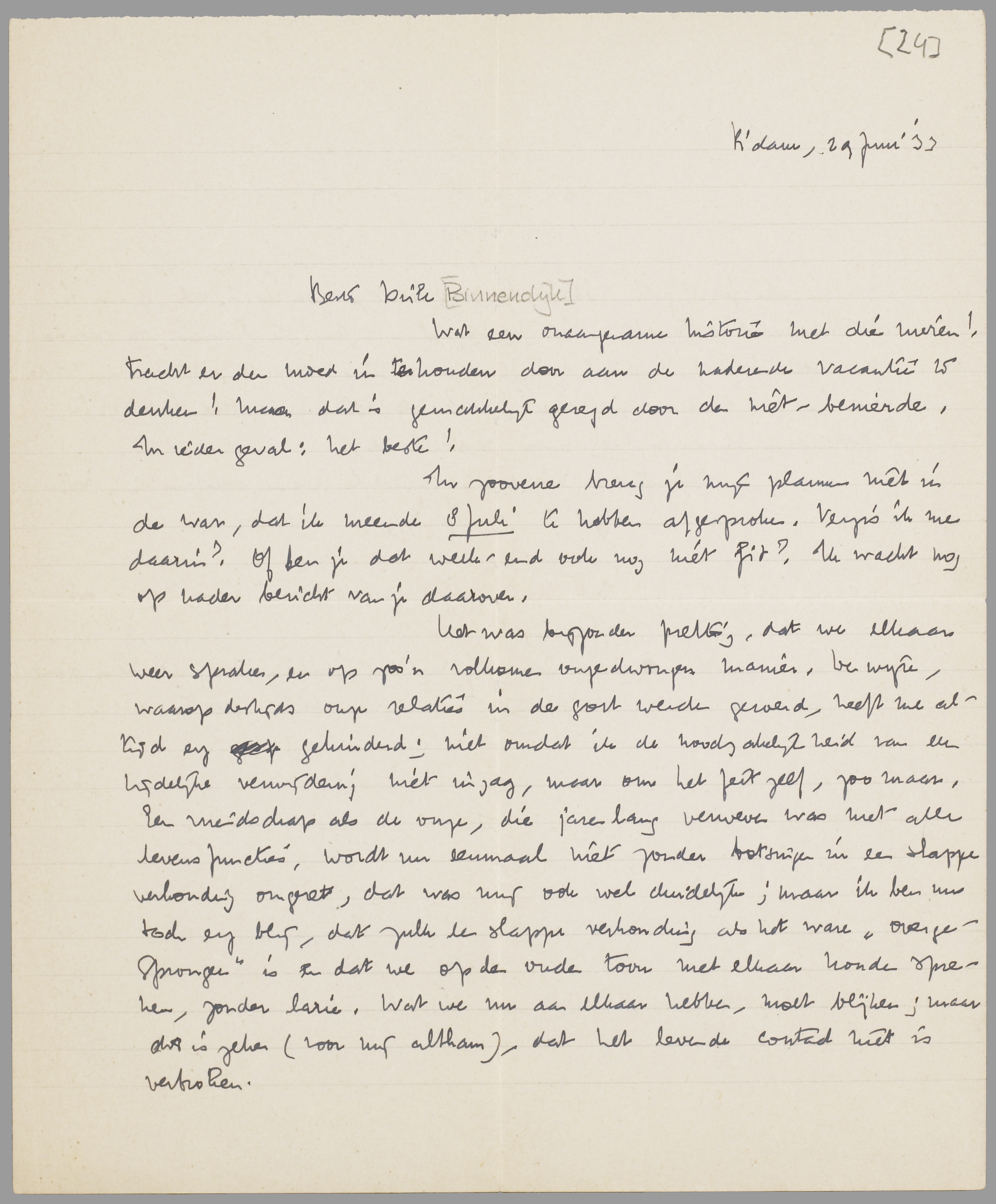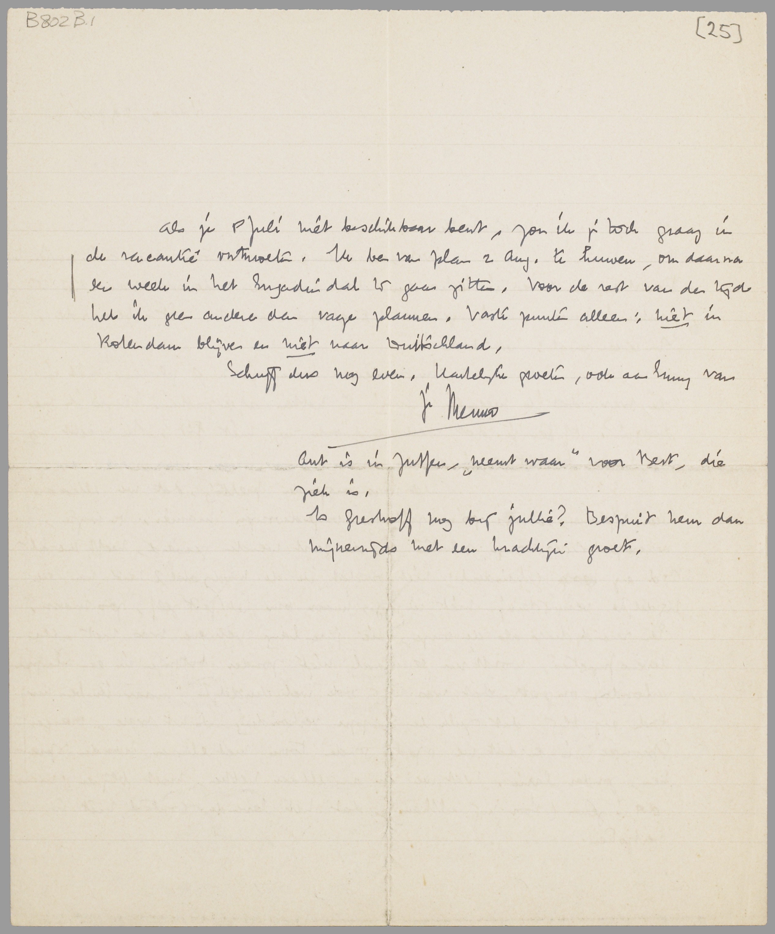 Als je 8 Juli niet beschikbaar bent, zou ik je toch graag in de vacantie ontmoeten. Ik ben van plan 2 Aug. te huwen, om daarna een week in het Engadindal te gaan zitten. Voor de rest van den tijd heb ik geen andere dan vage plannen. Vaste punten alleen: niet in Rotterdam blijven en niet naar Duitschland.