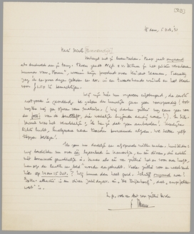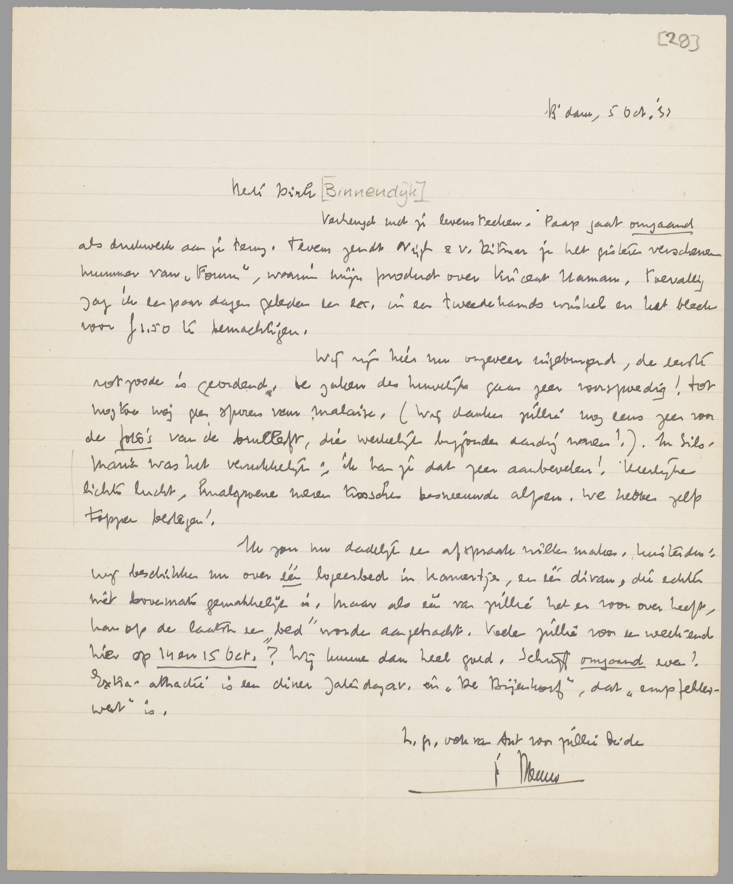 Verheugd met je levensteeken. Paap gaat omgaand als drukwerk aan je terug. Tevens zendt Nijgh & v. Ditmar je het gisteren verschenen nummer van ‘Forum’, waarin mijn product over Vincent Haman. Toevallig zag ik een paar dagen geleden een ex. in een tweedehands winkel en het bleek voor ƒ 1.50 te bemachtigen.