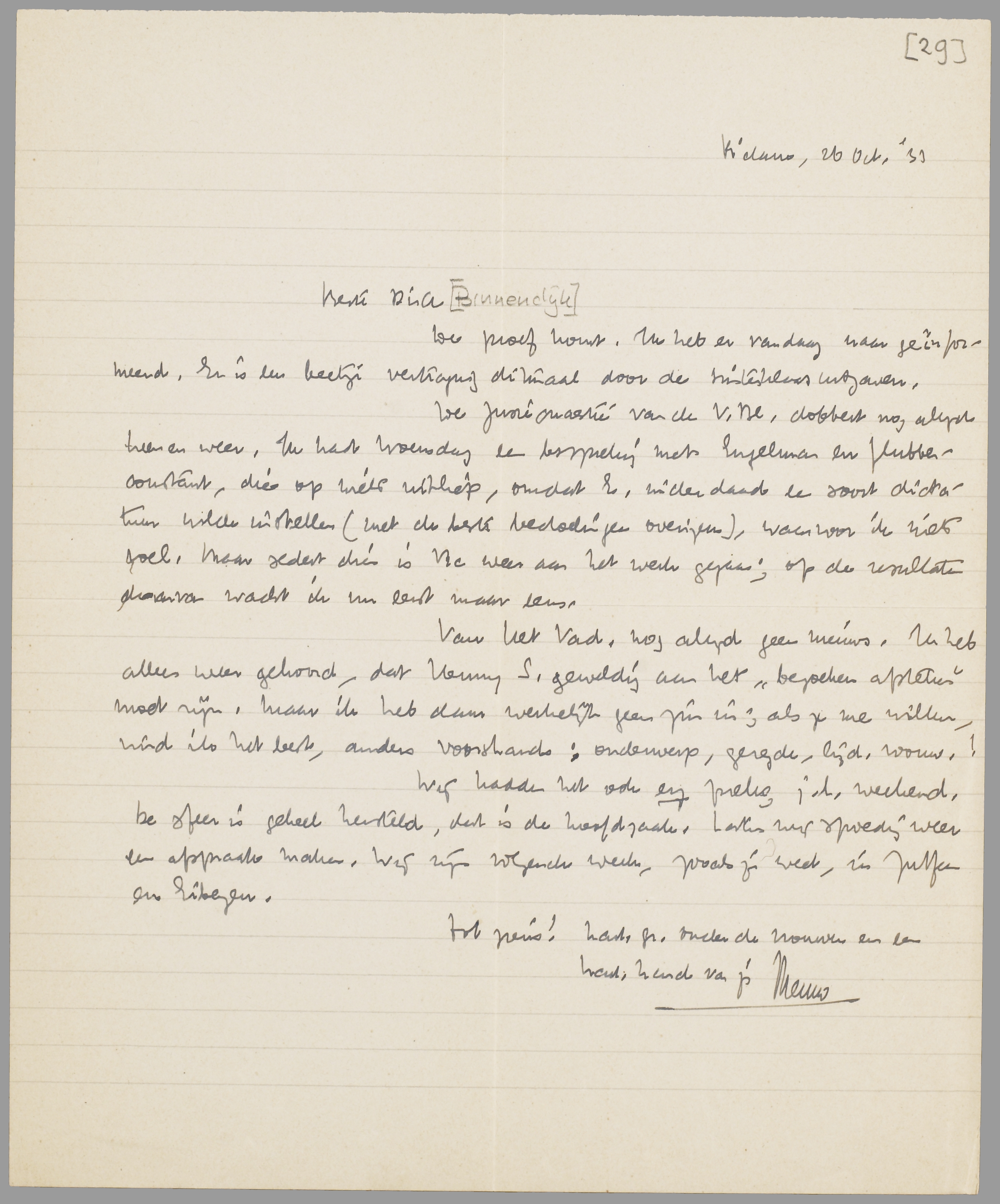 Van het Vad. nog altijd geen nieuws. Ik heb alleen weer gehoord, dat Henny S. geweldig aan het ‘bezoeken afsteken’ moet zijn. Maar ik heb daar werkelijk geen zin in; als ze me willen, vind ik het best, anders voorshands: onderwerp, gezegde, lijd. voorw.!