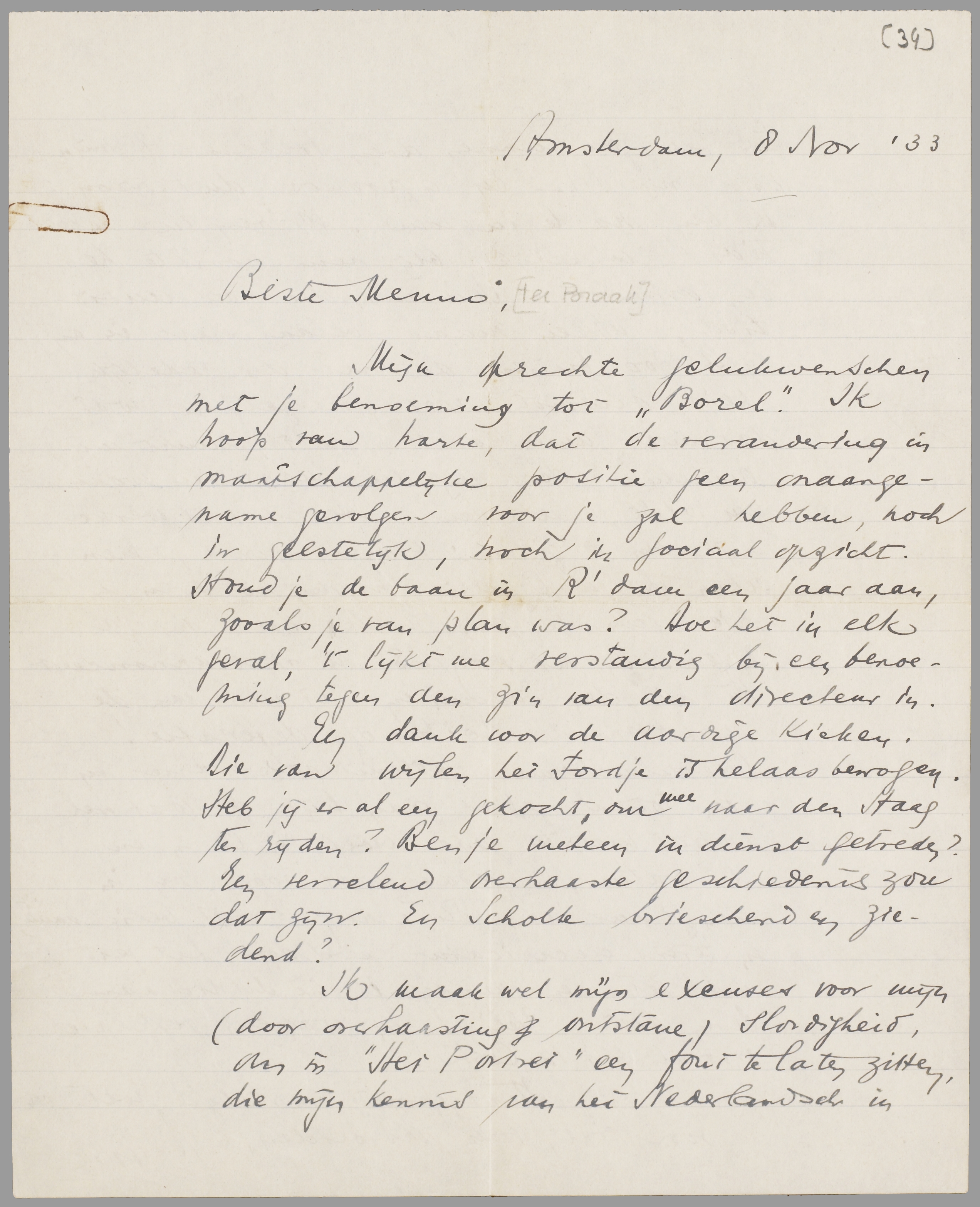 Mijn oprechte gelukwenschen met je benoeming tot ‘Borel’. Ik hoop van harte, dat de verandering in maatschappelijke positie geen onaangename gevolgen voor je zal hebben, noch in geestelijk, noch in sociaal opzicht. Houd je de baan in R'dam een jaar aan, zooals je van plan was? Doe het in elk geval, 't lijkt me verstandig bij een benoeming tegen den zin van den directeur in.