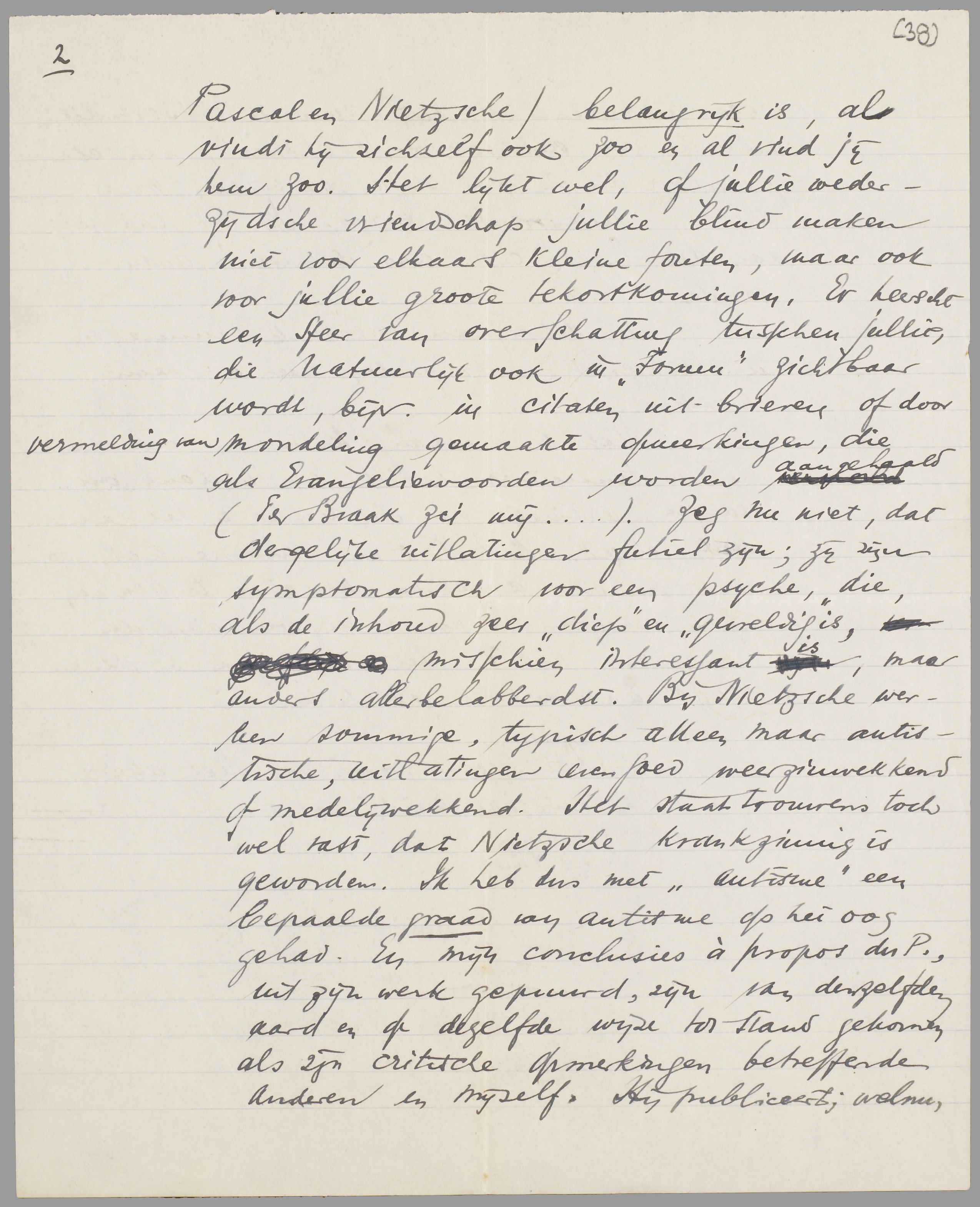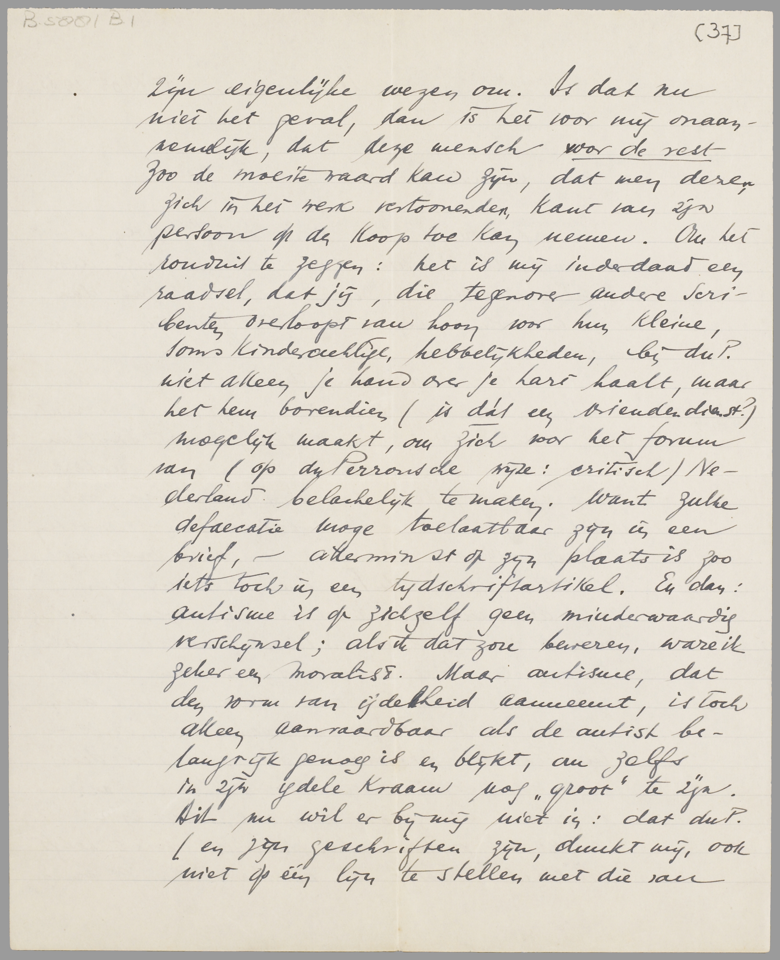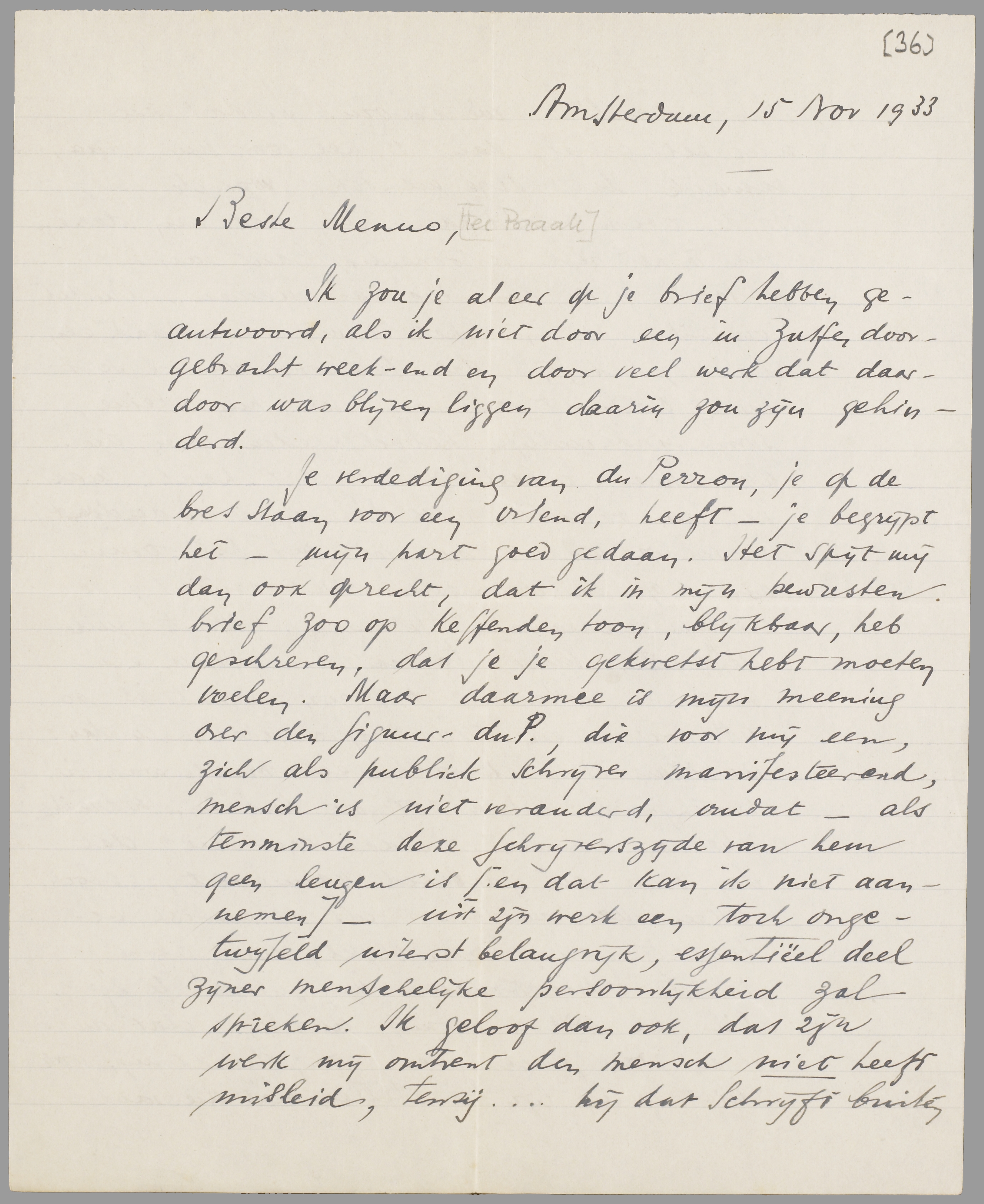 Je verdediging van du Perron, je op de bres staan voor een vriend, heeft - je begrijpt het - mijn hart goed gedaan. Het spijt mij dan ook oprecht, dat ik in mijn bewusten brief zoo op keffenden toon, blijkbaar, heb geschreven, dat je je gekwetst hebt moeten voelen. Maar daarmee is mijn meening over den figuur-du P., die voor mij een, zich als publiek schrijver manifesteerend, mensch is niet veranderd, omdat - als tenminste deze schrijverszijde van hem geen leugen is (en dat kan ik niet aannemen) - uit zijn werk een toch ongetwijfeld uiterst belangrijk, essentiëel deel zijner menschelijke persoonlijkheid zal spreken. Ik geloof dan ook, dat zijn werk mij omtrent den mensch niet heeft misleid, tenzij... hij dat schrijft buiten zijn eigenlijke wezen om. Is dat nu niet het geval, dan is het voor mij onaannemelijk, dat deze mensch voor de rest zoo de moeite waard kan zijn, dat men dezen zich in het werk vertoonenden, kant van zijn persoon op den koop toe kan nemen. Om het ronduit te zeggen: het is mij inderdaad een raadsel, dat jij, die tegenover andere scribenten overloopt van hoon voor hun kleine, soms kinderachtige, hebbelijkheden, bij du P. niet alleen je hand over je hart haalt, maar het hem bovendien (is dát een vriendendienst?) mogelijk maakt, om zich voor het forum van (op du Perronsche wijze: critisch) Nederland belachelijk te maken. Want zulke defaecatie moge toelaatbaar zijn in een brief, - allerminst op zijn plaats is zooiets toch in een tijdschriftartikel. En dan: autisme is op zichzelf geen minderwaardig verschijnsel; als ik dat zou beweren, ware ik zeker een moralist. Maar autisme, dat den vorm van ijdelheid aanneemt, is toch alleen aanvaardbaar als de autist belangrijk genoeg is en blijkt, om zelfs in zijn ijdele kraam nog ‘groot’ te zijn. Dit nu wil er bij mij niet in: dat du P. (en zijn geschriften zijn, dunkt mij, ook niet op één lijn te stellen met die van Pascal en Nietzsche) belangrijk is, al vindt hij zichzelf ook zoo en al vind jij hem zoo. Het lijkt wel, of jullie wederzijdsche vriendschap jullie blind maken - niet voor elkaars fouten, maar ook voor jullie groote tekortkomingen. Er heerscht een sfeer van overschatting tusschen jullie, die natuurlijk ook in ‘Forum’ zichtbaar wordt, bijv. in citaten uit brieven of door vermelding van mondeling gemaakte opmerkingen, die als Evangeliewoorden worden aangehaald (Ter Braak zei mij...). Zeg nu niet, dat dergelijke uitlatingen futiel zijn; zij zijn symptomatisch voor een psyche, die, als de inhoud zeer ‘diep’ en ‘geweldig’ is, misschien interessant is, maar anders allerbelabberdst. Bij Nietzsche werken sommige, typisch alleen maar autistische, uitlatingen evengoed weerzinwekkend of medelijwekkend. Het staat trouwens toch wel vast, dat Nietzsche krankzinnig is geworden. Ik heb dus met ‘autisme’ een bepaalde graad van autisme op het oog gehad. En mijn conclusie à propos du P., uit zijn werk gepuurd, zijn van denzelfden aard en op dezelfde wijze tot stand gekomen als zijn critische opmerkingen betreffende anderen en mijzelf. Hij publiceert; welnu, deze publicist is mij zuwider. Bovendien acht ik zijn onbevooroordeeldheid, een eigenschap die ik zeer sterk zou willen waardeeren, uitermate gering. Ik heb dat zelf aan den lijve (c.q. aan de ziel) ondervonden. -
