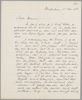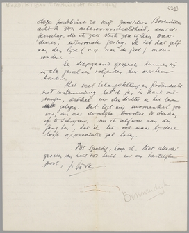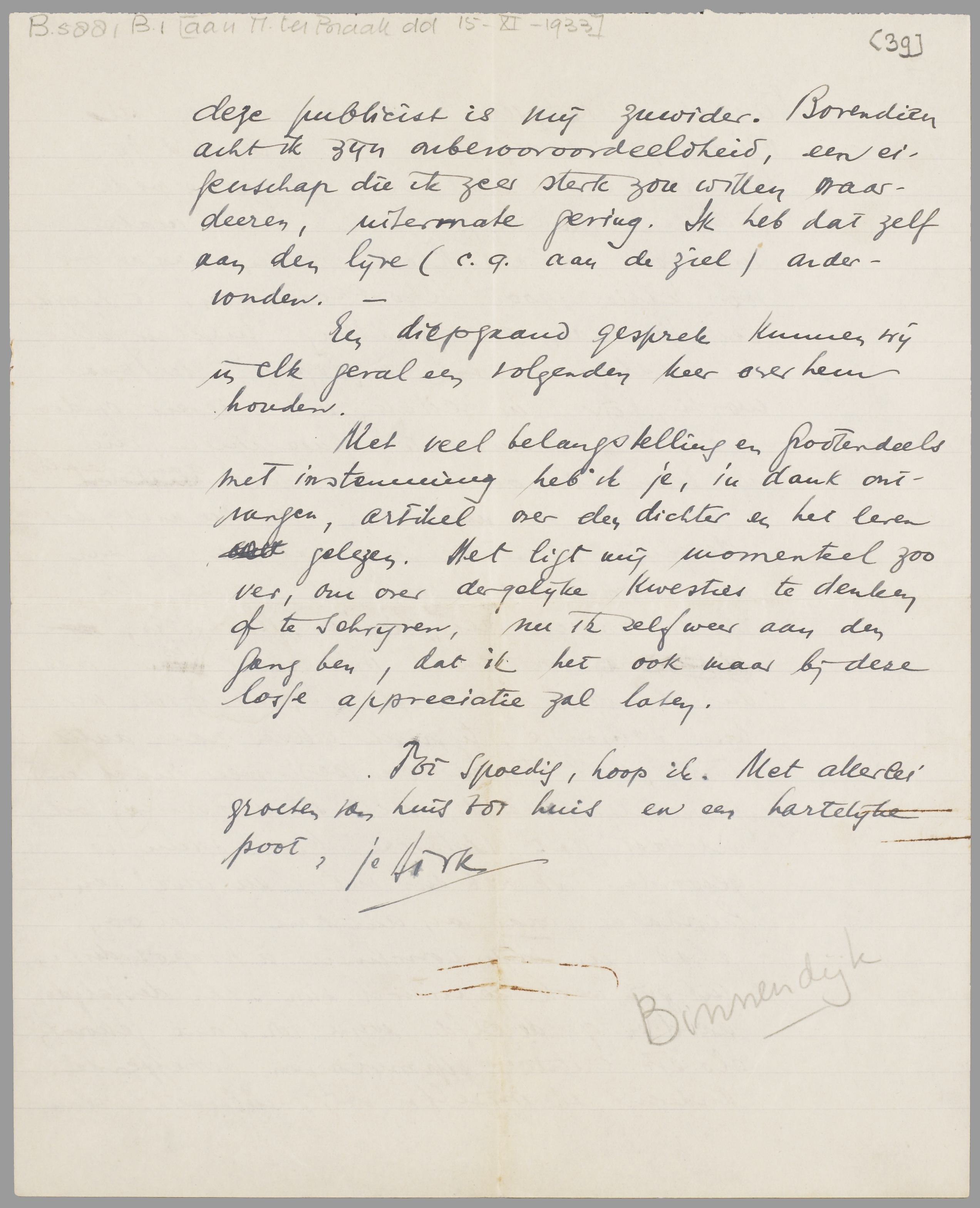 Met veel belangstelling en grootendeels met instemming heb ik je, in dank ontvangen, artikel over den dichter en het leven gelezen. Het ligt mij momenteel zoo ver, om over dergelijke kwesties te denken of te schrijven, nu ik zelf weer aan den gang ben, dat ik het ook maar bij deze losse appreciatie zal laten.