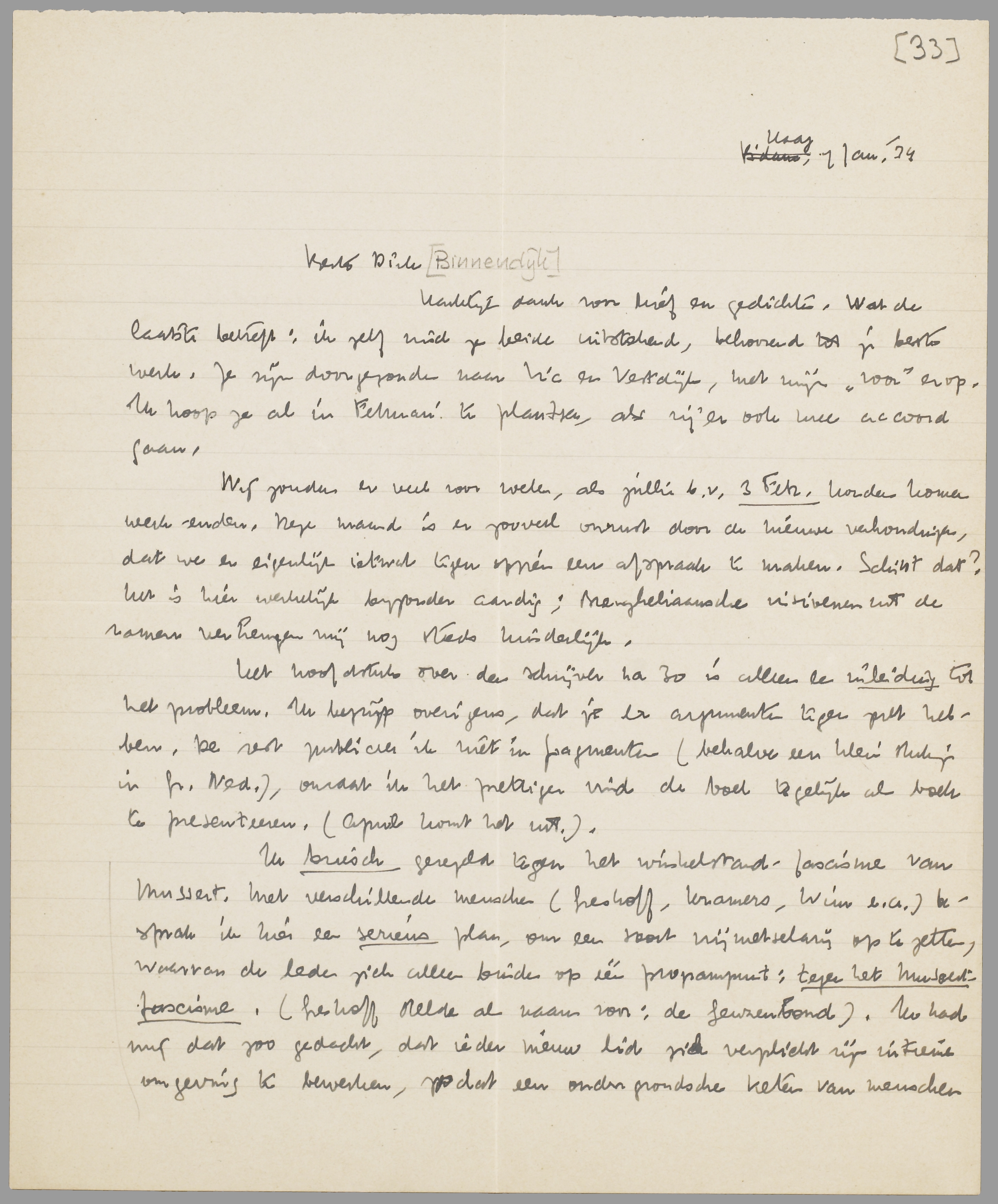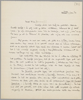 Wij zouden er veel voor voelen, als jullie b.v. 3 Febr. konden komen week-enden. Deze maand is er zooveel onrust door de nieuwe verhoudingen, dat we er eigenlijk ietwat tegen opzien een afspraak te maken. Schikt dat? Het is hier werkelijk bijzonder aardig; Breugheliaansche visioenen uit de ramen verheugen mij nog steeds kinderlijk.