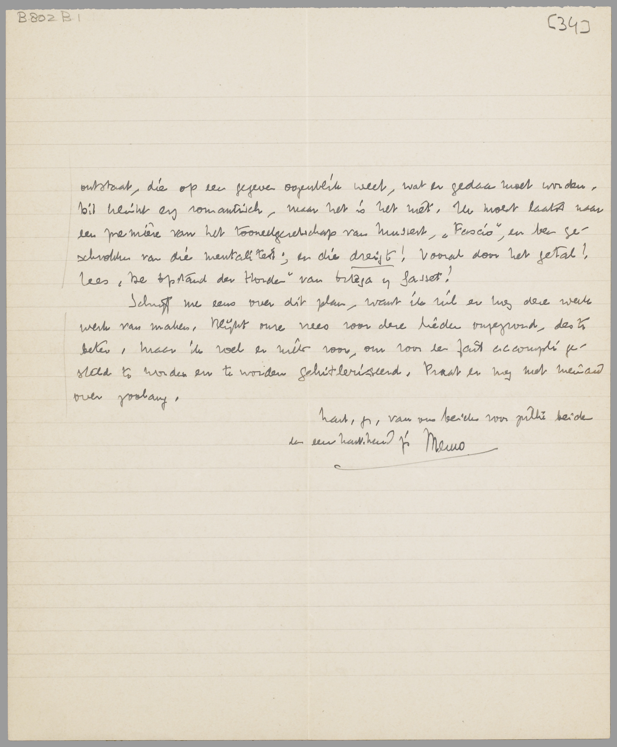 Ik briesch geregeld tegen het winkelstand-fascisme van Mussert. Met verschillende menschen (Greshoff, Kramers, Wim e.a.) besprak ik hier een serieus plan, om een soort vrijmetselarij op te zetten, waarvan de leden zich alleen binden op één programpunt: tegen het Mussert-fascisme. (Greshoff stelde al naam voor: de Geuzenbond). Ik had mij dat zoo gedacht, dat ieder nieuw lid zich verplicht zijn intieme omgeving te bewerken, zoodat een ondergrondsche keten van menschen ontstaat, die op een gegeven oogenblik weet, wat er gedaan moet worden. Dit klinkt erg romantisch, maar het is het niet. Ik moest laatst naar een première van het tooneelgezelschap van Mussert, ‘Fascio’, en ben geschrokken van die mentaliteit; en die dreigt! Vooral door het getal! Lees ‘De opstand der Horden’ van Ortega y Gasset!