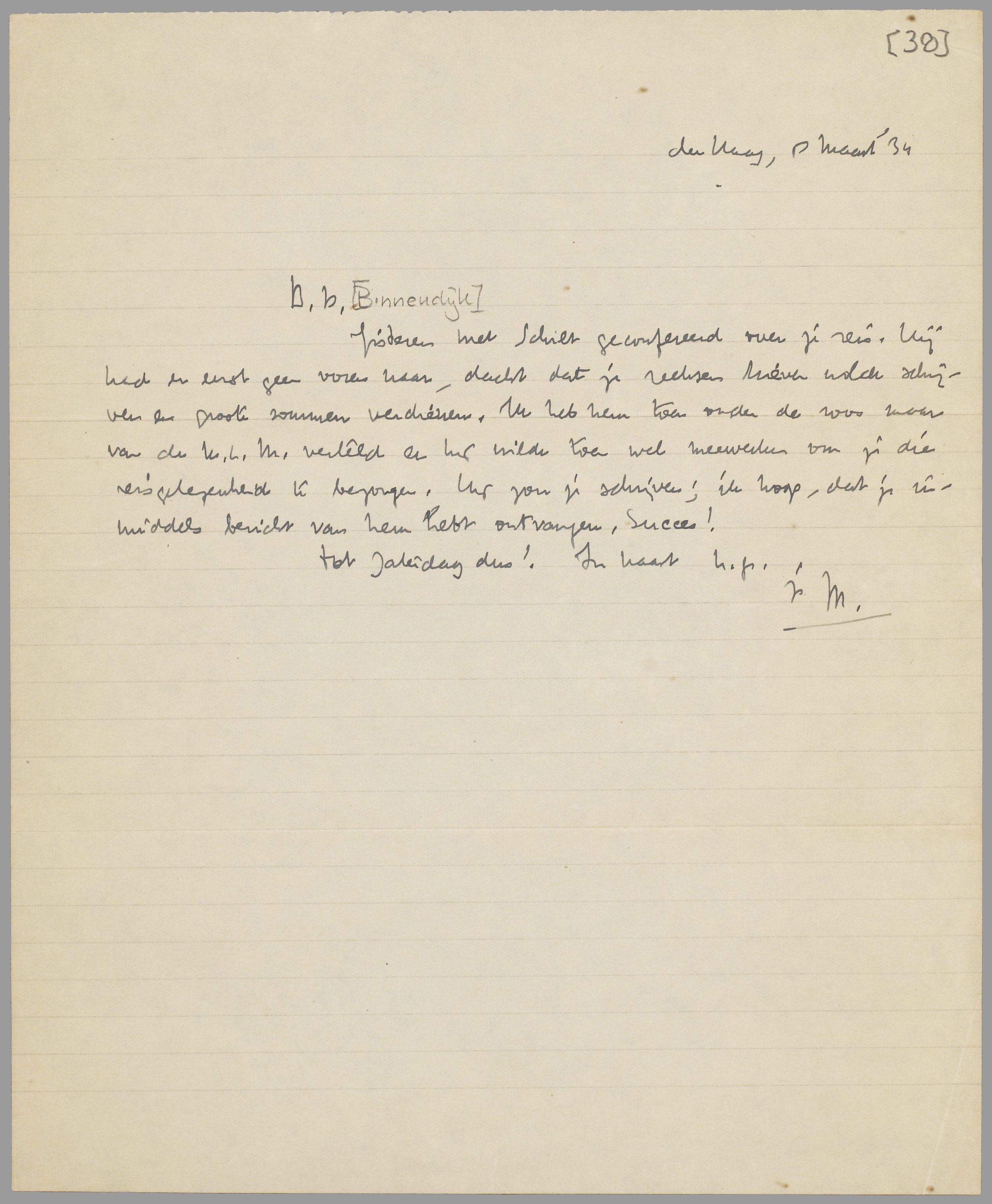 Gisteren met Schilt geconfereerd over je reis. Hij had er eerst geen ooren naar, dacht dat je reeksen brieven wilde schrijven en groote sommen verdienen. Ik heb hem toen onder de soos maar van de K.L.M. verteld en hij wilde toen wel meewerken om je die reisgelegenheid te bezorgen. Hij zou je schrijven; ik hoop, dat je inmiddels bericht van hem hebt ontvangen. Succes!