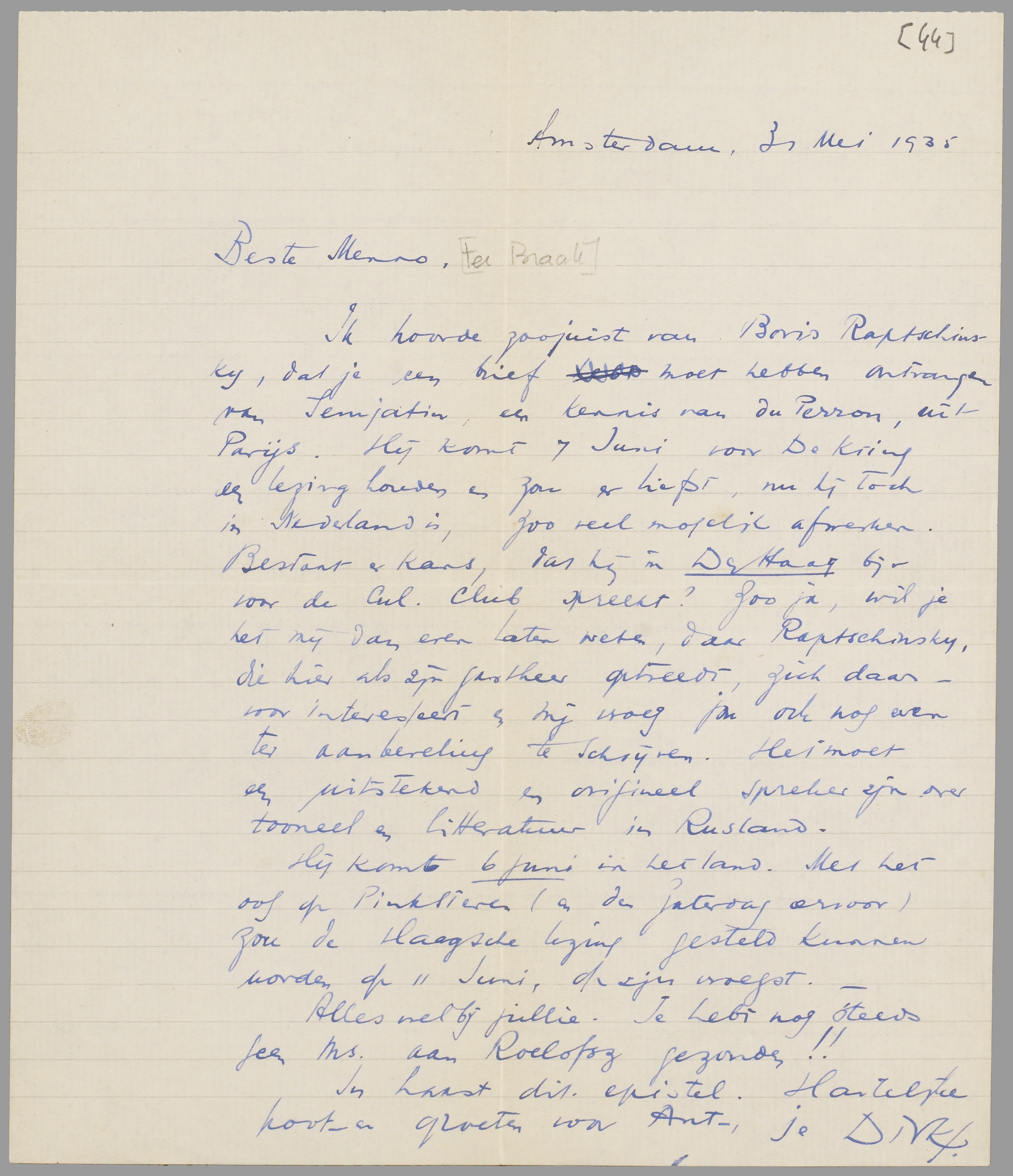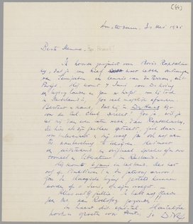 Ik hoorde zoojuist van Boris Raptschinsky, dat je een brief moet hebben ontvangen van Semjatin, een kennis van du Perron, uit Parijs. Hij komt 7 Juni voor De Kring een lezing houden en zou er liefst, nu hij toch in Nederland is, zoo veel mogelijk afwerken. Bestaat er kans, dat hij in Den Haag bijv. voor de Cul. Club spreekt? Zoo ja, wil je het mij dan even laten weten, daar Raptschinsky, die hier als zijn gastheer optreedt, zich daarvoor interesseert en mij vroeg jou ook nog even ter aanbeveling te schrijven. Het moet een uitstekend en origineel spreker zijn over tooneel en litteratuur in Rusland.