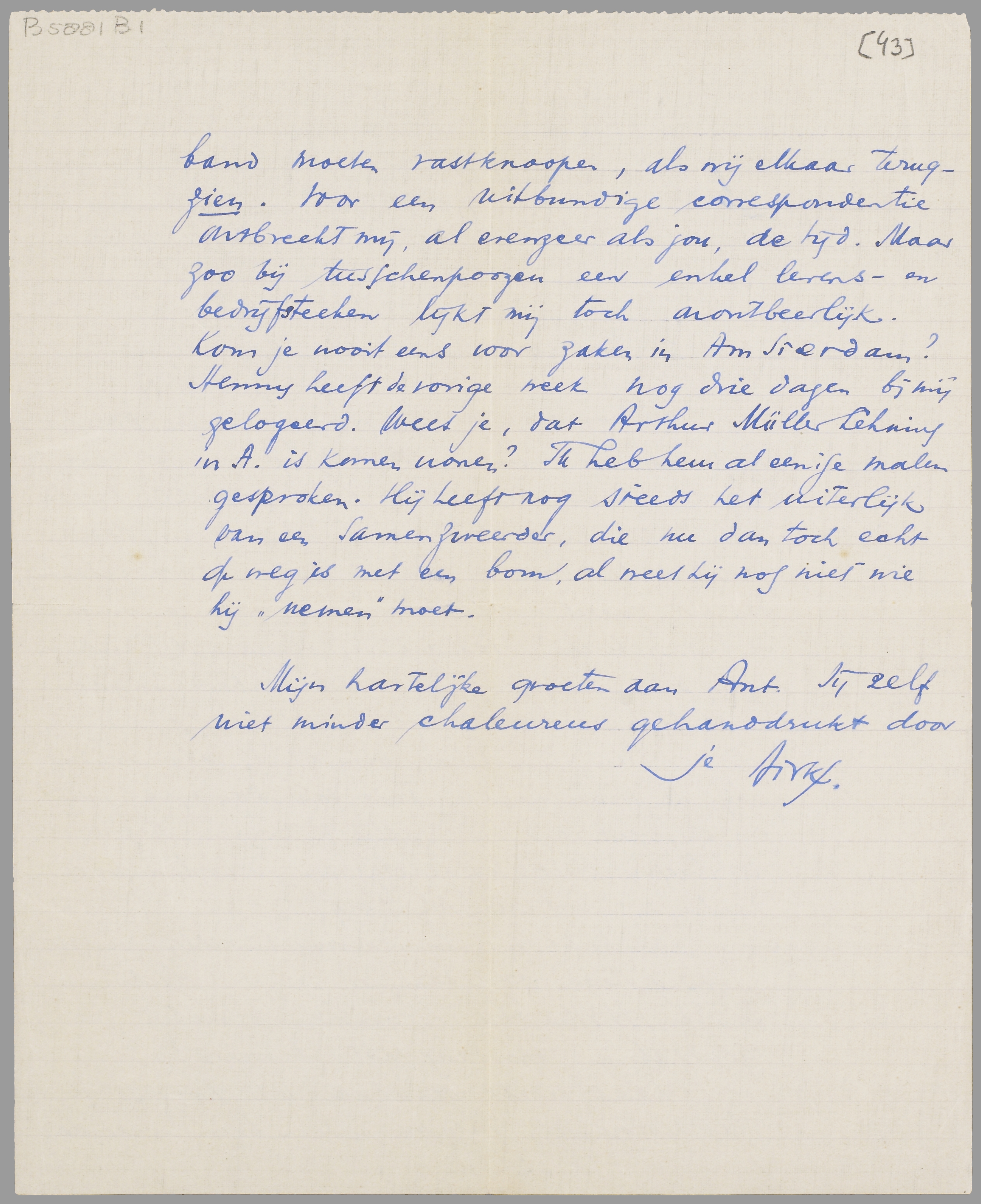 Laat in elk geval eens iets hooren. Ik heb het gevoel, dat wij iederen keer weer den band moeten vastknopen, als wij elkaar terugzien. Voor een uitbundige correspondentie ontbreekt mij, al evenzeer als jou, de tijd. Maar zoo bij tusschenpoozen een enkel levens- en bedrijfsteeken lijkt mij toch onontbeerlijk. Kom je nooit eens voor zaken in Amsterdam? Henny heeft de vorige week nog drie dagen bij mij gelogeerd. Weet je, dat Arthur Müller-Lehning in A. is komen wonen? Ik heb hem al eenige malen gesproken. Hij heeft nog steeds het uiterlijk van een samenzweerder, die nu dan toch echt op weg is met een bom, al weet hij nog niet wie hij ‘nemen’ moet.