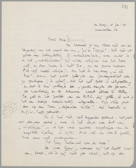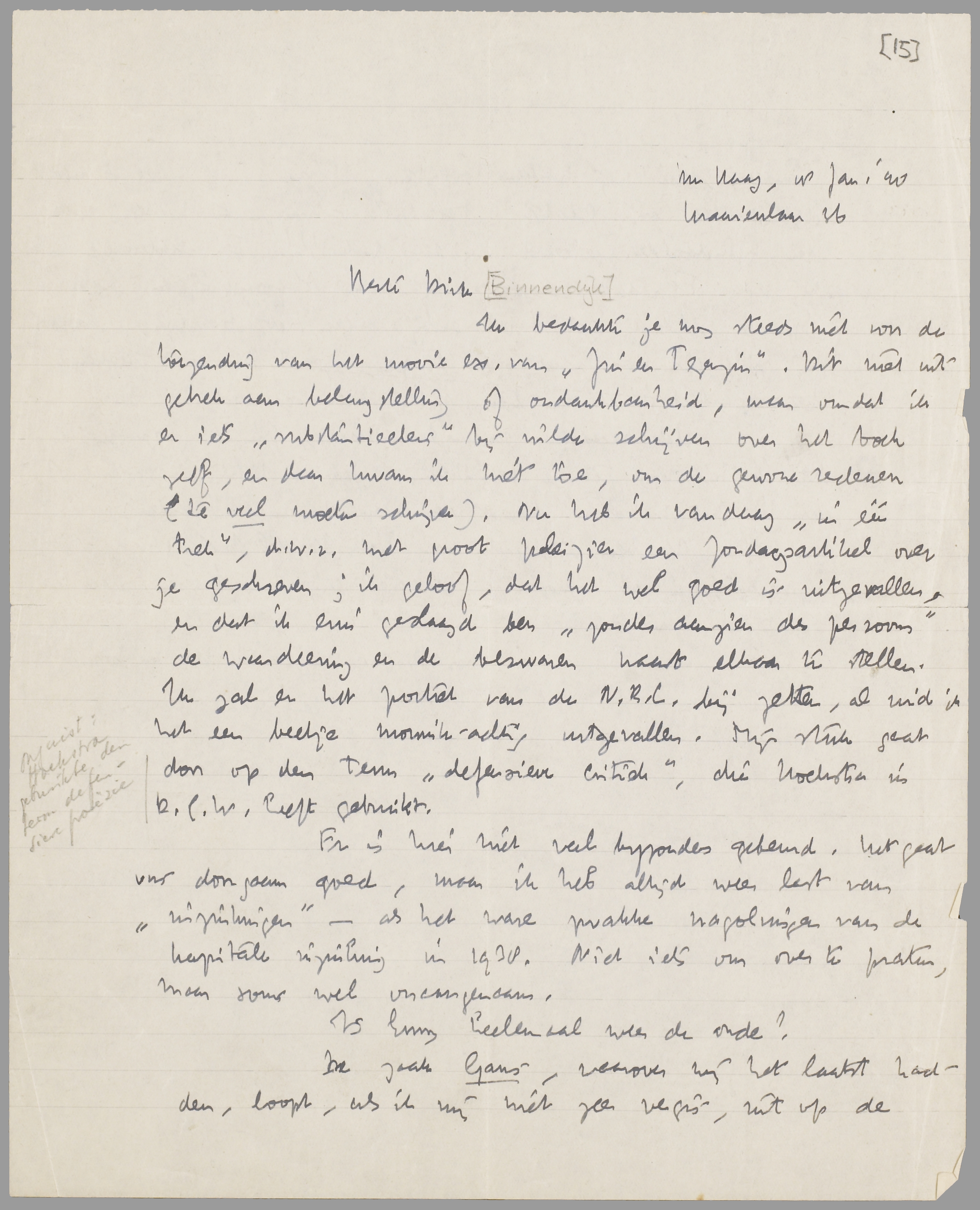 Ik bedankte je nog steeds niet voor de toezending van het mooie ex. van ‘Zin en Tegenzin’. Dit niet uit gebrek aan belangstelling of ondankbaarheid, maar omdat ik er iets ‘substantieelers’ bij wilde schrijven over het boek zelf, en daar kwam ik niet toe, om de gewone redenen (te veel moeten schrijven). Nu heb ik vandaag ‘in één trek’, d.w.z. met groot pleizier een Zondagsartikel over je geschreven; ik geloof, dat het wel goed is uitgevallen en dat ik erin geslaagd ben ‘zonder aanzien des persoons’ de waardering en de bezwaren naast elkaar te stellen. Ik zal er het portret van de N.R.C. bij zetten, al vind ik het een beetje monnik-achtig uitgevallen. Mijn stuk gaat door op den term ‘defensieve critiek’, die Hoekstra in D.G.W. heeft gebruikt.