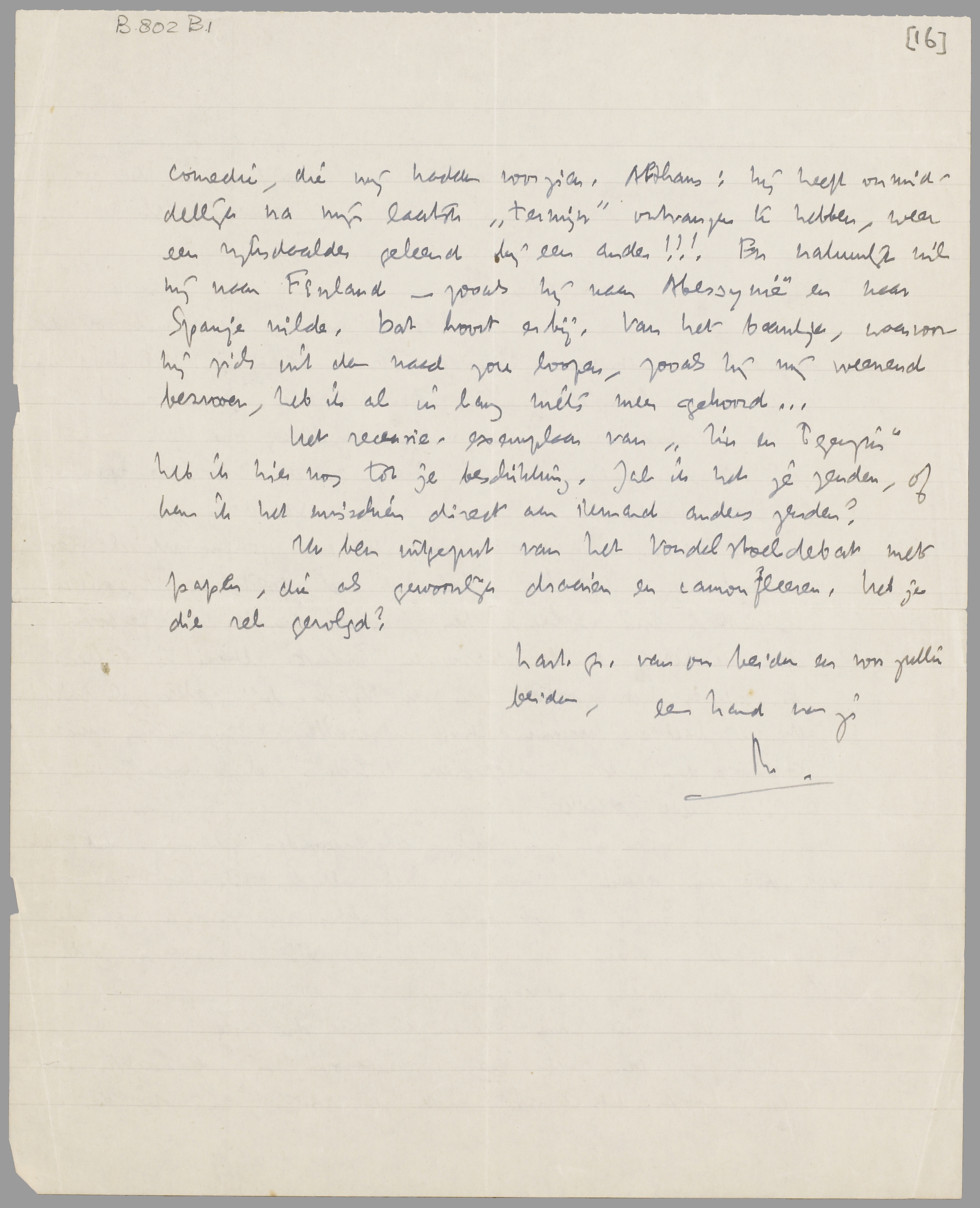 De zaak Gans, waarover wij het laatst hadden, loopt, als ik mij niet zeer vergis, uit op de comedie, die wij hadden voorzien. Althans: hij heeft onmiddellijk na mijn laatste ‘termijn’ ontvangen te hebben, weer een rijksdaalder geleend bij een ander!!! En natuurlijk wil hij naar Finland - zooals hij naar Abessynië en naar Spanje wilde. Dat hoort erbij. Van het baantje, waarvoor hij zich uit den naad zou loopen, zooals hij mij weenend bezwoer, heb ik al lang niets meer gehoord...
