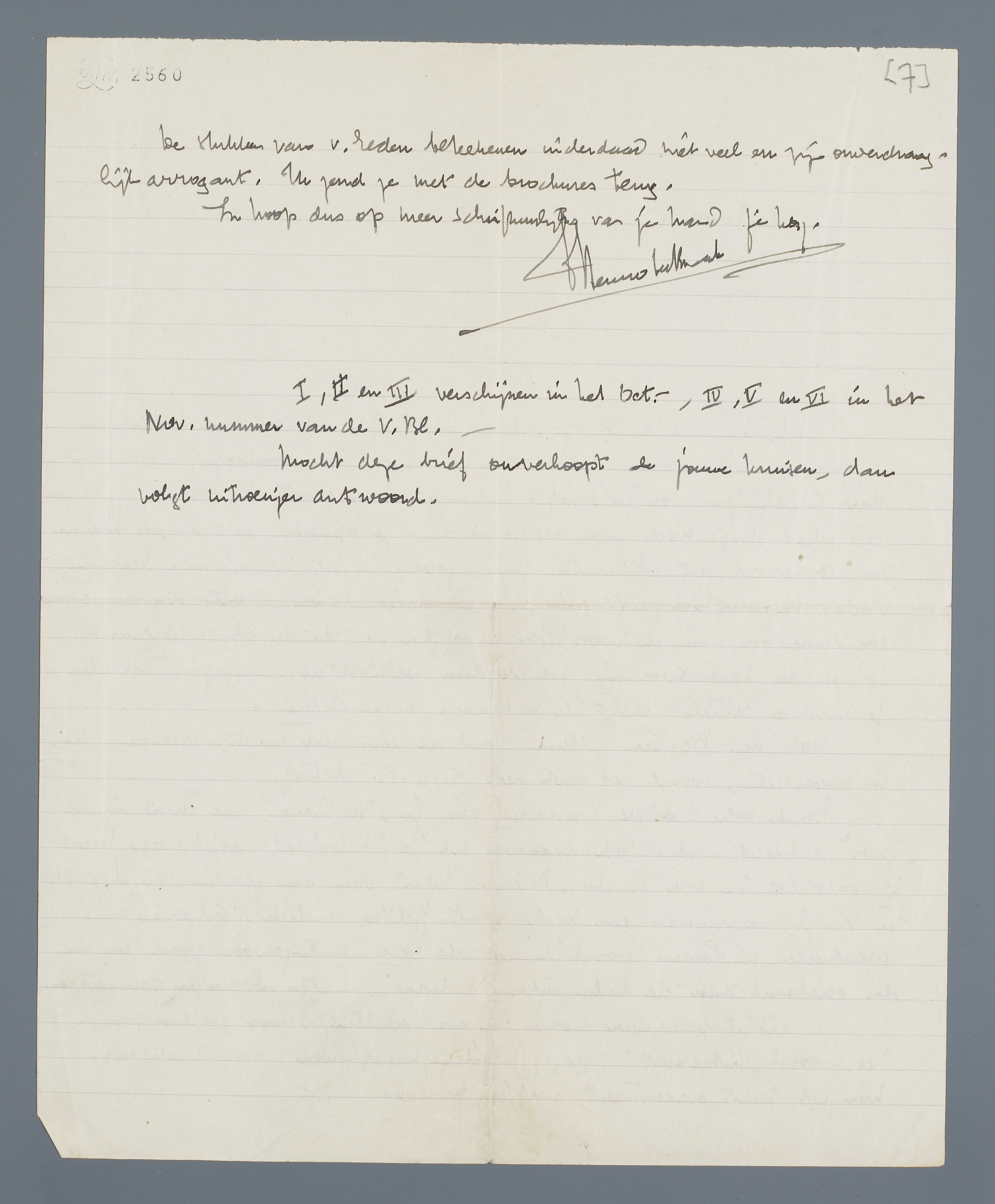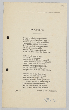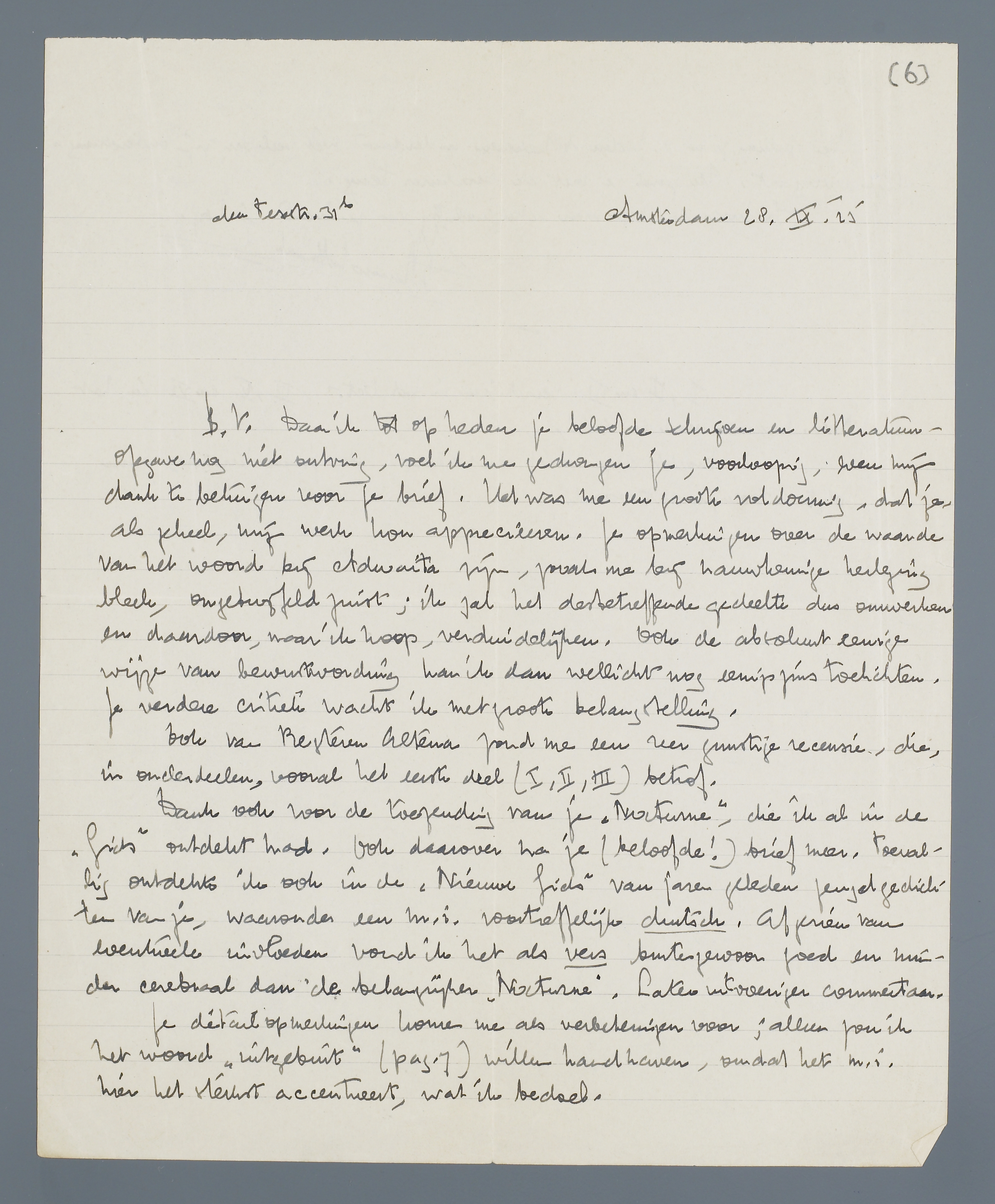 Dank ook voor de toezending van je ‘Nocturne’, die ik al in de ‘Gids’ ontdekt had. Ook daarover na je (beloofde!) brief meer. Toevallig ontdekte in ook in de ‘Nieuwe Gids’ van jaren geleden jeugdgedichten van je, waaronder een m.i. voortreffelijk duitsch. Afgezien van eventueele invloeden vond ik het als vers buitengewoon goed en minder cerebraal dan de belangrijker ‘Nocturne’. Later uitvoeriger commentaar.
