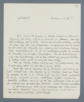 Daar ik tot op heden je beloofde schrijven en litteratuuropgave nog niet ontving, voel ik me gedwongen je, voorloopig, even mijn dank te betuigen voor je brief. Het was me een groote voldoening, dat je als geheel, mijn werk kon apprecieeren. Je opmerkingen over de waarde van het woord bij Adwaita zijn, zooals me bij nauwkeurige herlezing bleek, ongetwijfeld juist; ik zal het desbetreffende gedeelte dus omwerken en daardoor, naar ik hoop, verduidelijken. Ook de absoluut eenige wijze van bewustwording kan ik dan wellicht nog eenigszins toelichten. Je verdere critiek wacht ik met groote belangstelling.