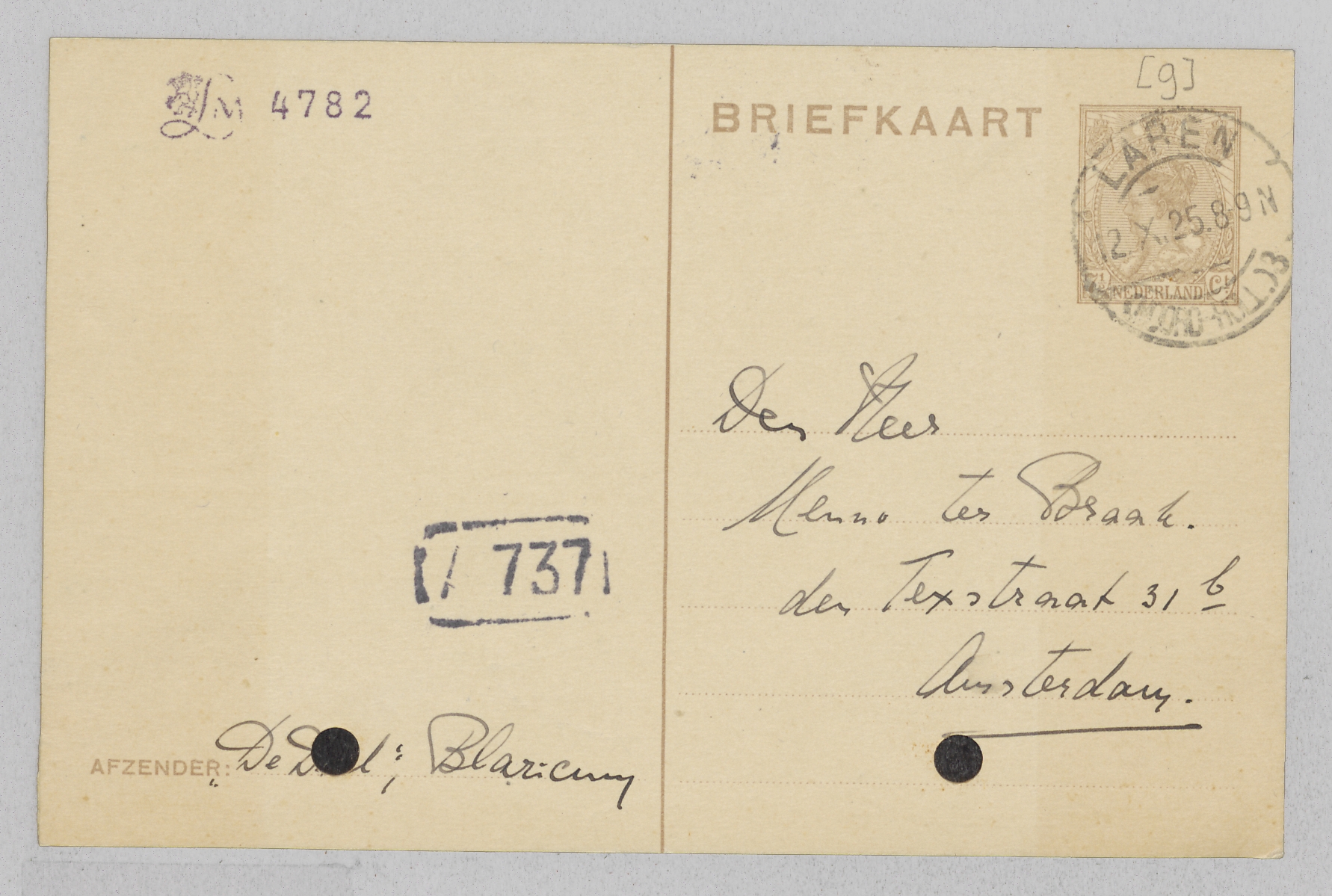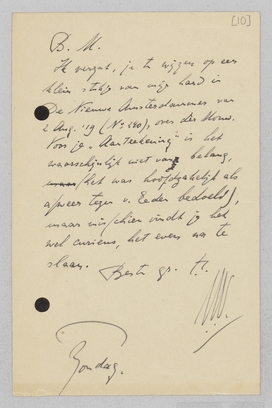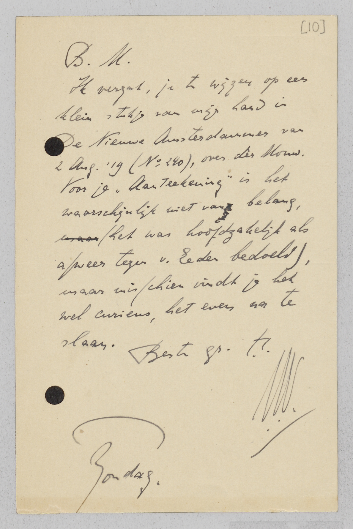 Ik vergat, je te wijzen op een klein stukje van mijn hand in De Nieuwe Amsterdammer van 2 Aug. '19 (No 240), over dèr Mouw. Voor je Aanteekening is het waarschijnlijk niet van belang, maar (het was hoofdzakelijk als afweer tegen v. Eeden bedoeld), maar misschien vindt je het wel curieus, het even na te slaan.