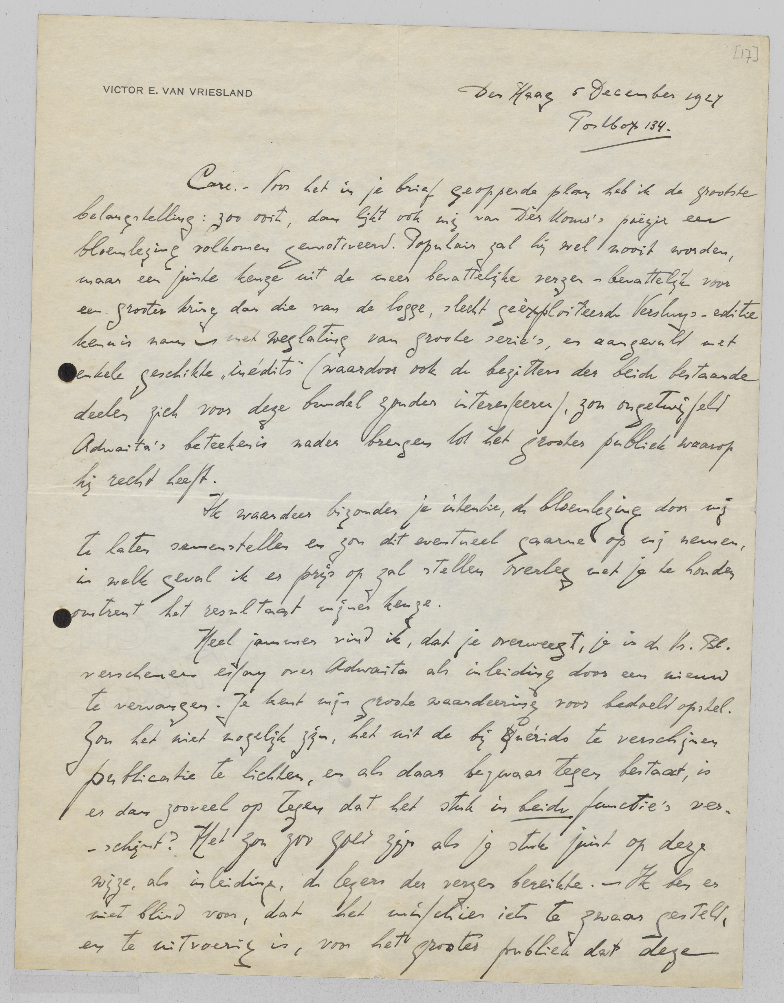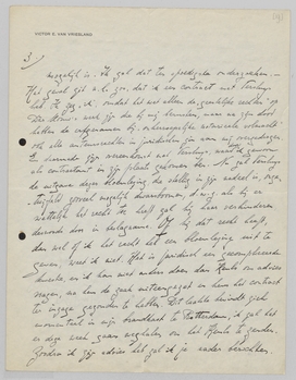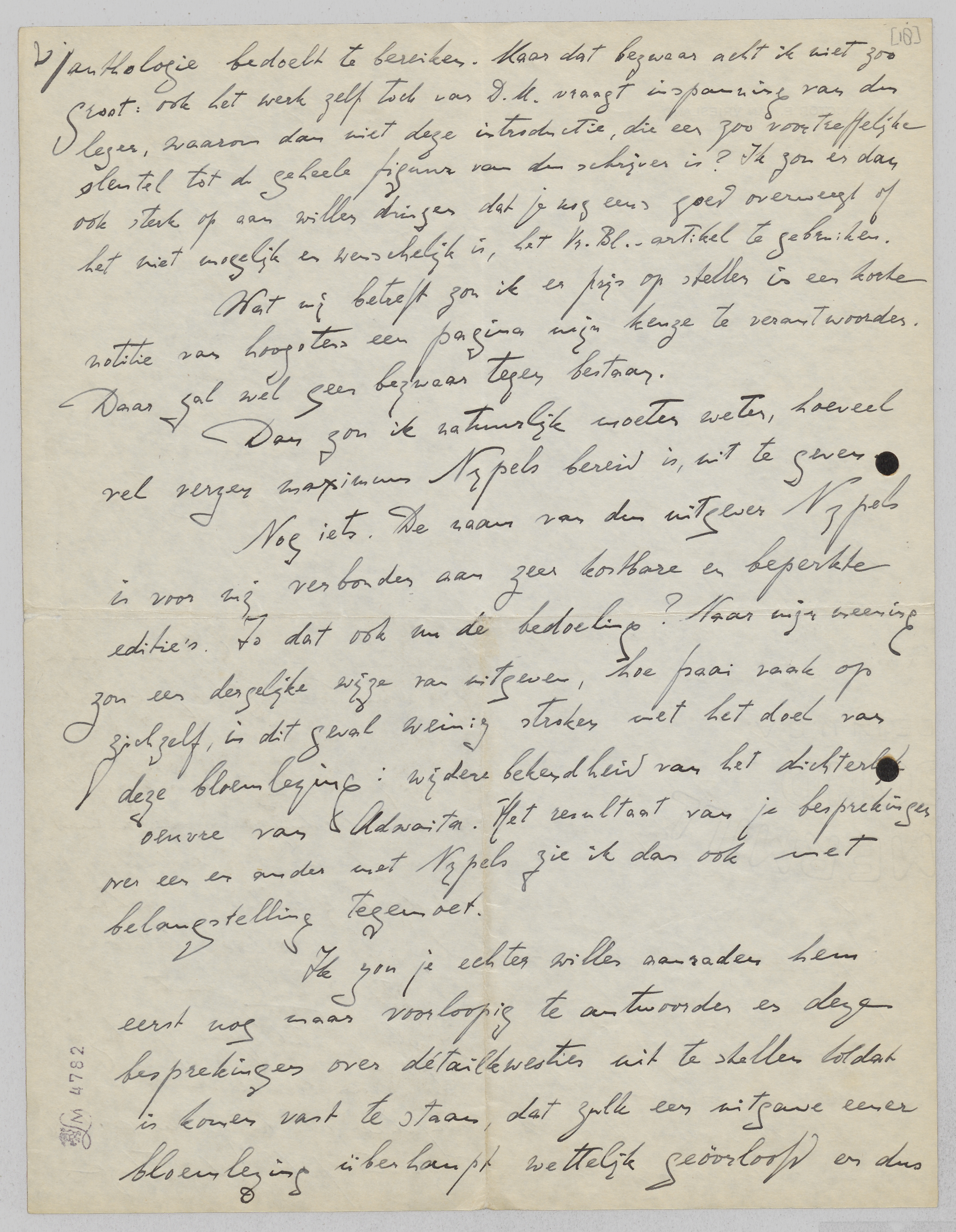 Heel jammer vind ik, dat je overweegt, je in de Vr. Bl. verschenen essay over Adwaita als inleiding door een nieuw te vervangen. Je kent mijn groote waardeering voor bedoeld opstel. Zou het niet mogelijk zijn, het uit de bij Querido te verschijnen publicatie te lichten, en als daar bezwaar tegen bestaat, is er dan zooveel bezwaar dat het stuk in beide functie's verschijnt? Het zou zoo goed zijn als je stuk juist op deze wijze, als inleiding, de lezers der verzen bereikte. - Ik ben er niet blind voor, dat het misschien iets te zwaar gesteld en te uitvoerig is, voor het grooter publiek dat deze anthologie bedoelt te bereiken. Maar dat bezwaar acht ik niet zoo groot: ook het werk zelf toch van D.M. vraagt inspanning van den lezer, waarom dan niet deze introductie, die een zoo voortreffelijke sleutel tot de geheele figuur van den schrijver is? Ik zou er dan ook sterk op aan willen dringen dat je nog eens goed overweegt of het niet wenschelijk is, het Vr. Bl.-artikel te gebruiken.