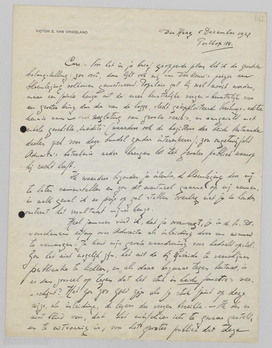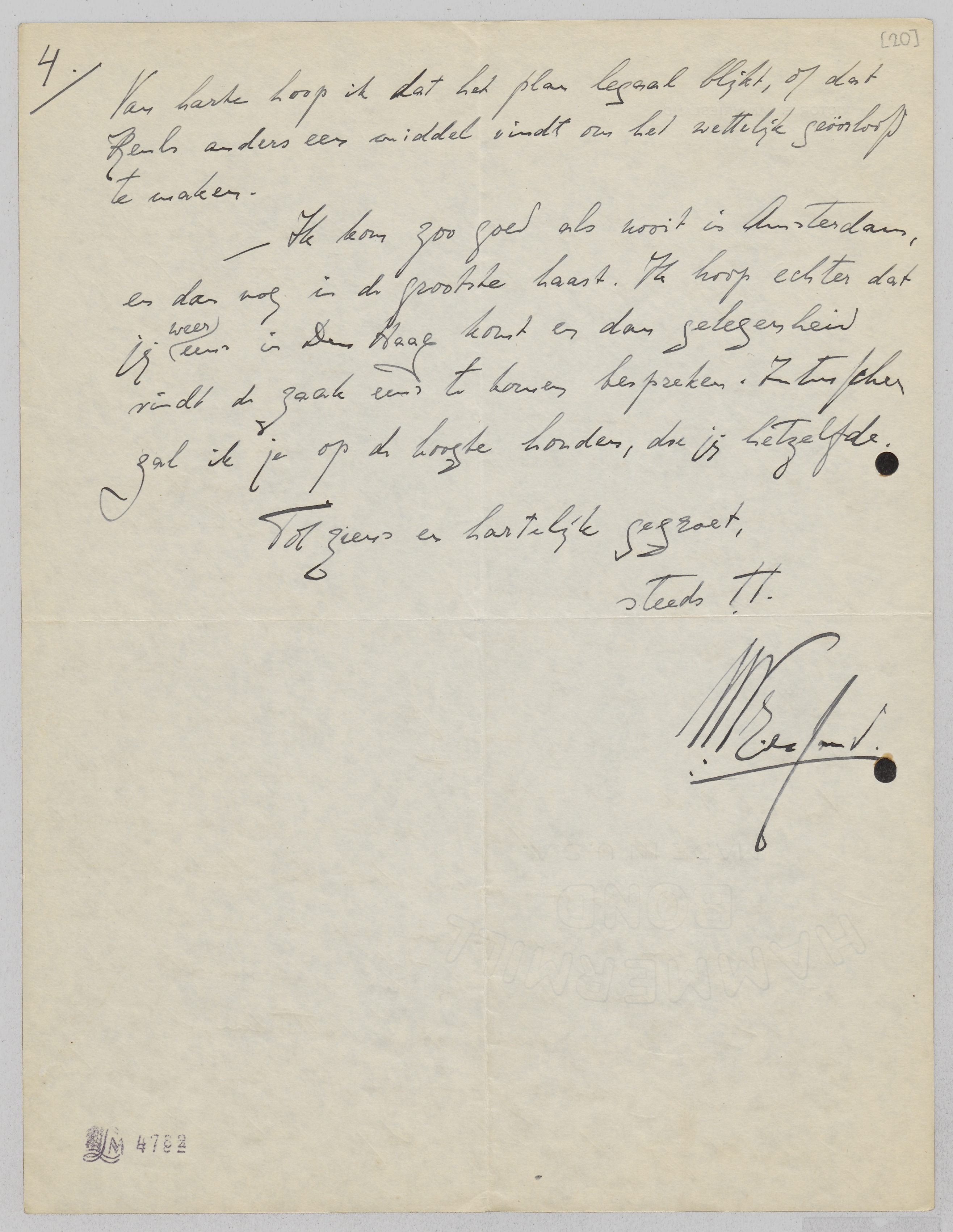 - Ik kom zoo goed als nooit in Amsterdam, en dan nog in de grootste haast. Ik hoop echter dat jij weer eens in Den Haag komt en dan gelegenheid vindt de zaak eens te komen bespreken. Intusschen zal ik je op de hoogte houden, doe jij hetzelfde.