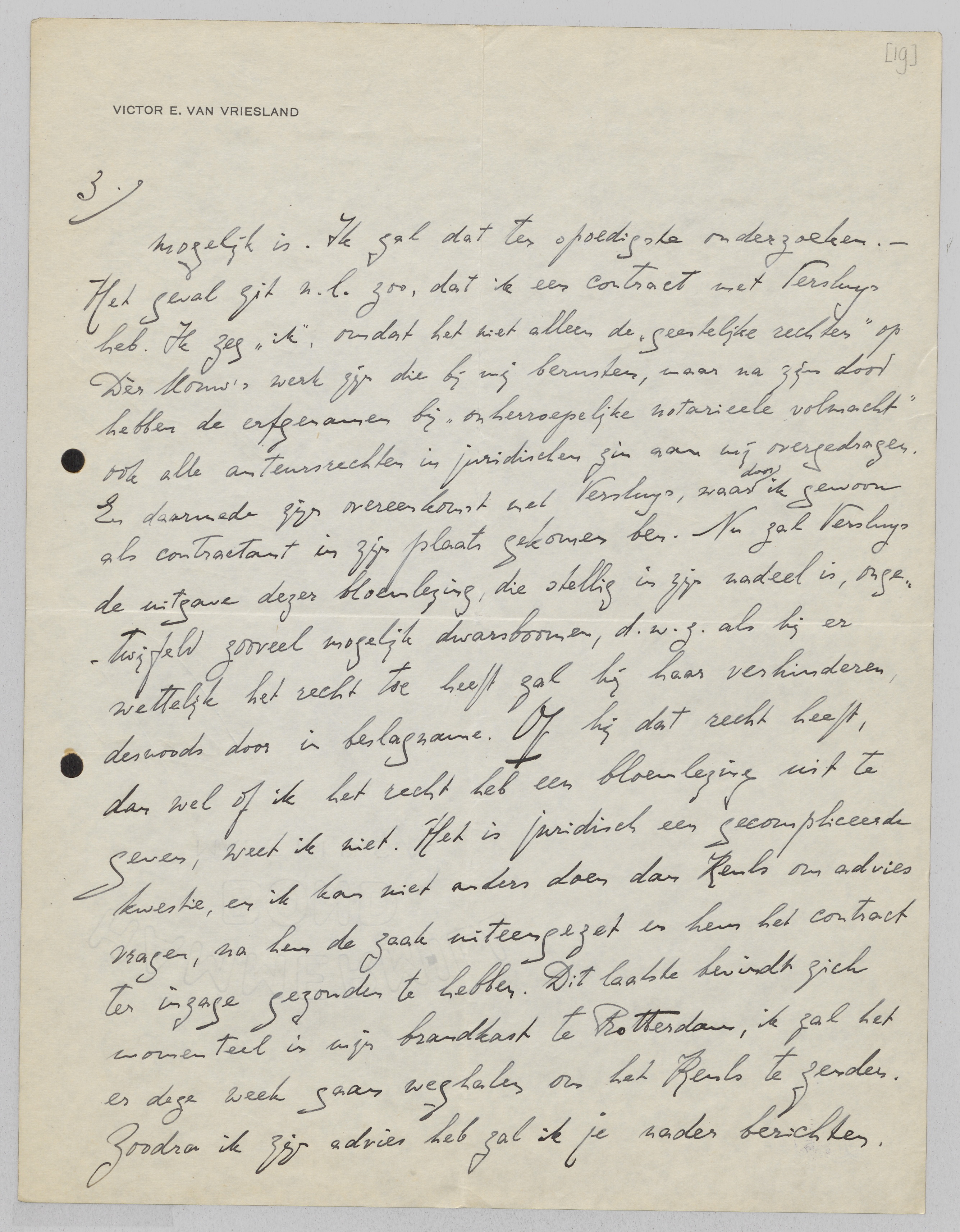 Ik zou je echter willen aanraden hem eerst nog maar voorloopig te antwoorden en deze besprekingen over détailkwesties uit te stellen totdat is komen vast te staan, dat zulk een uitgave eener bloemlezing überhaupt wettelijk geöorloofd en dus mogelijk is. Ik zal dat ter spoedigste onderzoeken. - Het geval zit n.l. zoo, dat ik een contract met Versluys heb. Ik zeg ‘ik’, omdat het niet alleen de ‘geestelijke rechten’ op Dèr Mouw's werk zijn die bij mij berusten, maar na zijn dood hebben de erfgenamen ‘bij onherroepelijke materieele volmacht’ ook alle auteursrechten in juridischen zin aan mij overgedragen. En daarmede zijn overeenkomst met Versluys, waardoor ik gewoon als contractant in zijn plaats gekomen ben. Nu zal Versluys de uitgave dezer bloemlezing, die stellig in zijn nadeel is, ongetwijfeld zooveel mogelijk dwarsboomen, d.w.z. als hij er wettelijk het recht toe heeft zal hij haar verhinderen, desnoods door in beslagname. Of hij dat recht heeft, dan wel of ik het recht heb een bloemlezing uit te geven, weet ik niet. Het is juridisch een gecompliceerde kwestie, en ik kan niet anders doen dan Keuls om advies vragen, na hem de zaak uiteengezet en hem het contract ter inzage gezonden te hebben. Dit laatste bevindt zich momenteel in mijn brandkast te Rotterdam, ik zal het er deze week gaan weghalen om het Keuls te zenden. Zoodra ik zijn advies heb zal ik je nader berichten. Van harte hoop ik dat het plan legaal blijkt, of dat Keuls anders een middel vindt om het wettelijk geöorloofd te maken.
