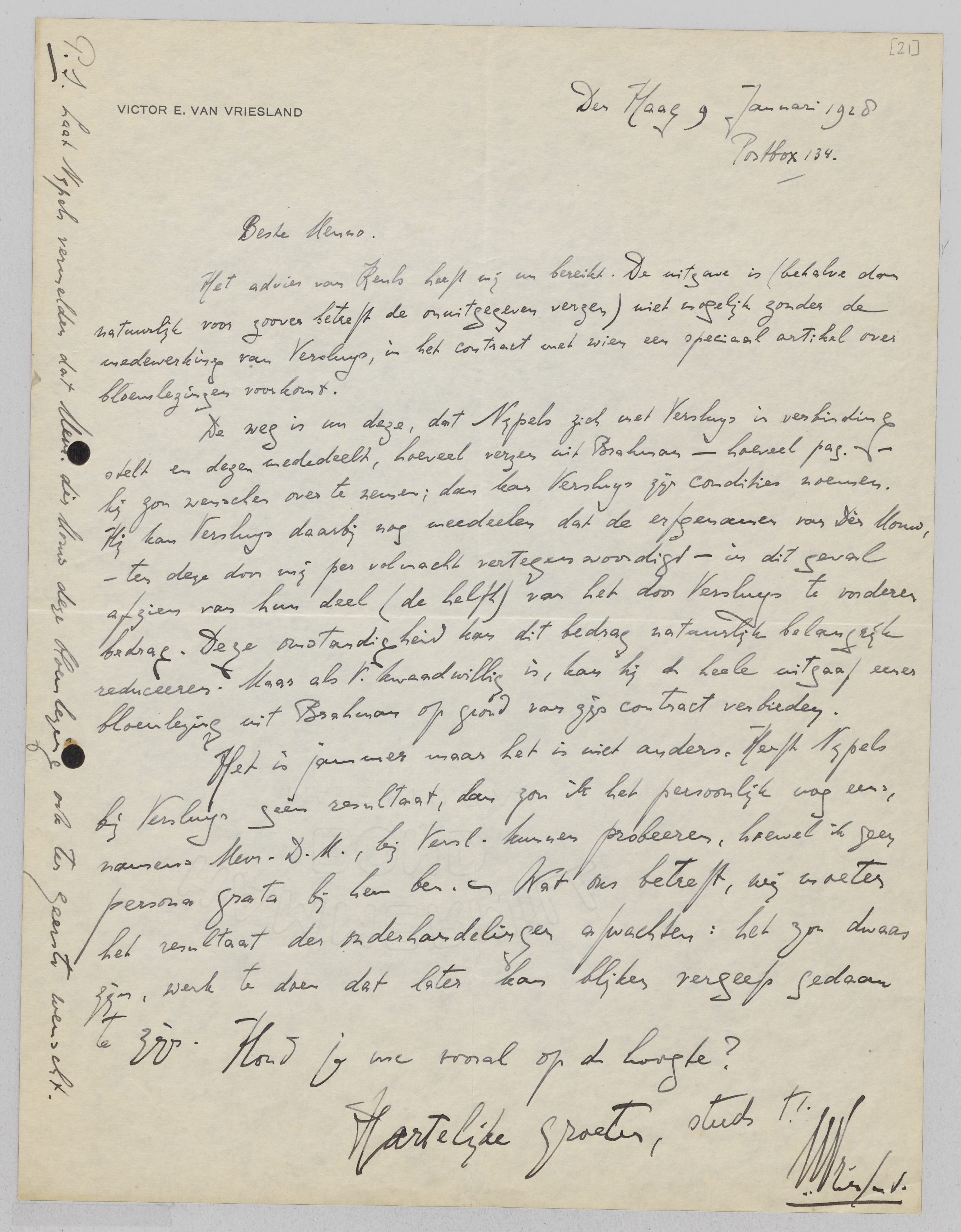 De weg is een deze, dat Nypels zich met Versluys in verbinding stelt en dezen mededeelt, hoeveel verzen uit Brahman - hoeveel pag. - hij zou wenschen over te nemen;. dan kan Versluys zijn condities noemen. Hij kan Versluys daarbij nog meedeelen dat de erfgenamen van Dèr Mouw - ter deze door mij per volmacht vertegenwoordigd - in dit geval afzien van hun deel (de helft) van het door Versluys te vorderen bedrag. Deze omstandigheid kan dit bedrag natuurlijk belangrijk reduceeren. Maar als V. kwaadwillig is, kan hij de heele uitgaaf eener bloemlezing uit Brahman op grond van zijn contract verbieden.