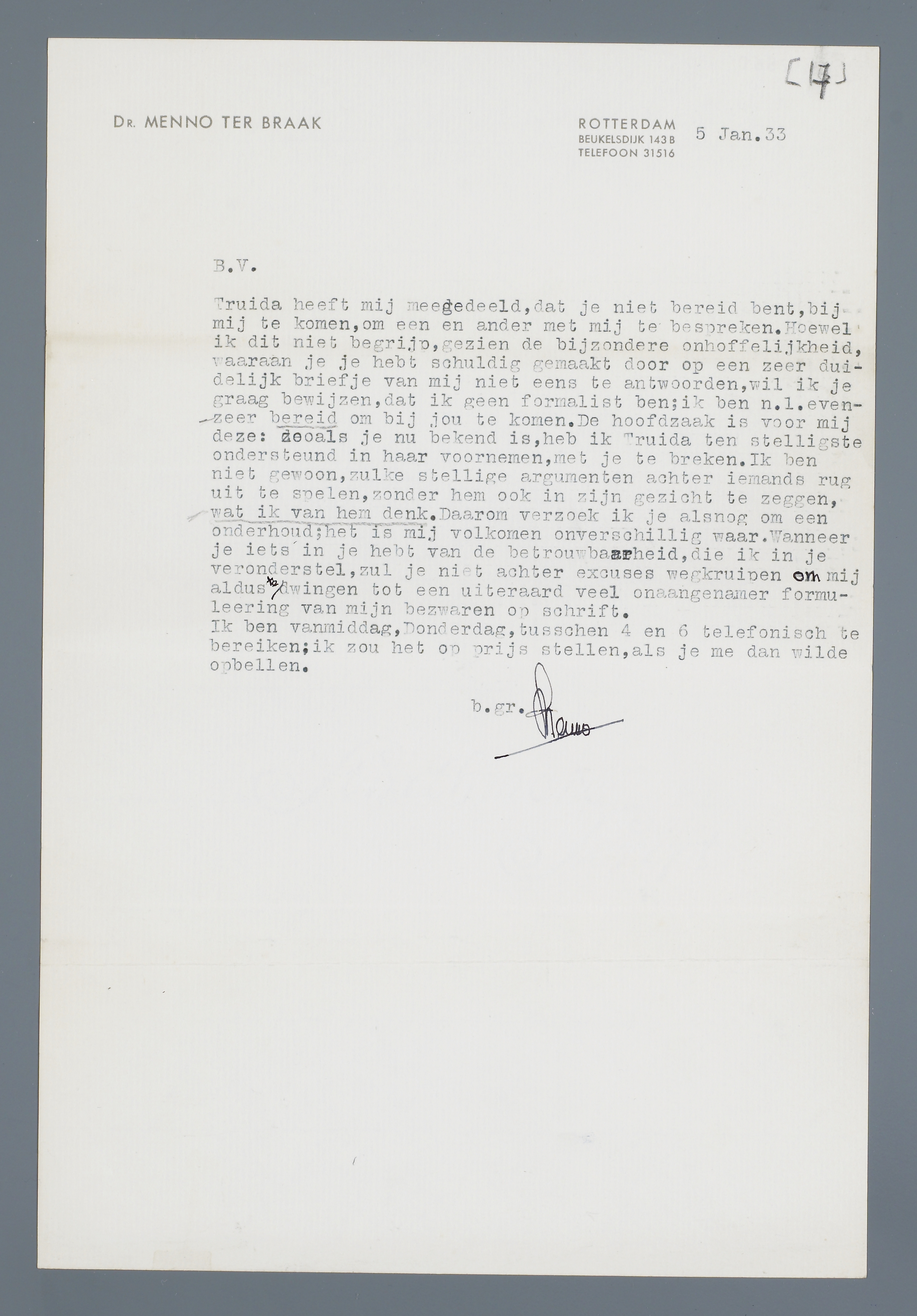 Truida heeft mij meegedeeld, dat je niet bereid bent, bij mij te komen, om een en ander met mij te bespreken. Hoewel ik dit niet begrijp, gezien de bijzondere onhoffelijkheid, waaraan je je hebt schuldig gemaakt door op een zeer duidelijk briefje van mij niet eens te antwoorden, wil ik je graag bewijzen, dat ik geen formalist ben; ik ben n.l. evenzeer bereidi om bij jou te komen. De hoofdzaak is voor mij deze: zooals je nu bekend is, heb ik Truida ten stelligste ondersteund in haar voornemen, met je te breken. Ik ben niet gewoon, zulke stellige argumenten achter iemands rug uit te spelen, zonder hem ook in zijn gezicht te zeggen, wat ik van hem denk. Daarom verzoek ik je alsnog om een onderhoud; het is mij volkomen onverschillig waar. Wanneer je iets in je hebt van de betrouwbaarheid, die ik in je veronderstel, zul je niet achter excuses wegkruipen om mij aldus te dwingen tot een uiteraard veel onaangenamer formuleering van mijn bezwaren op schrift.