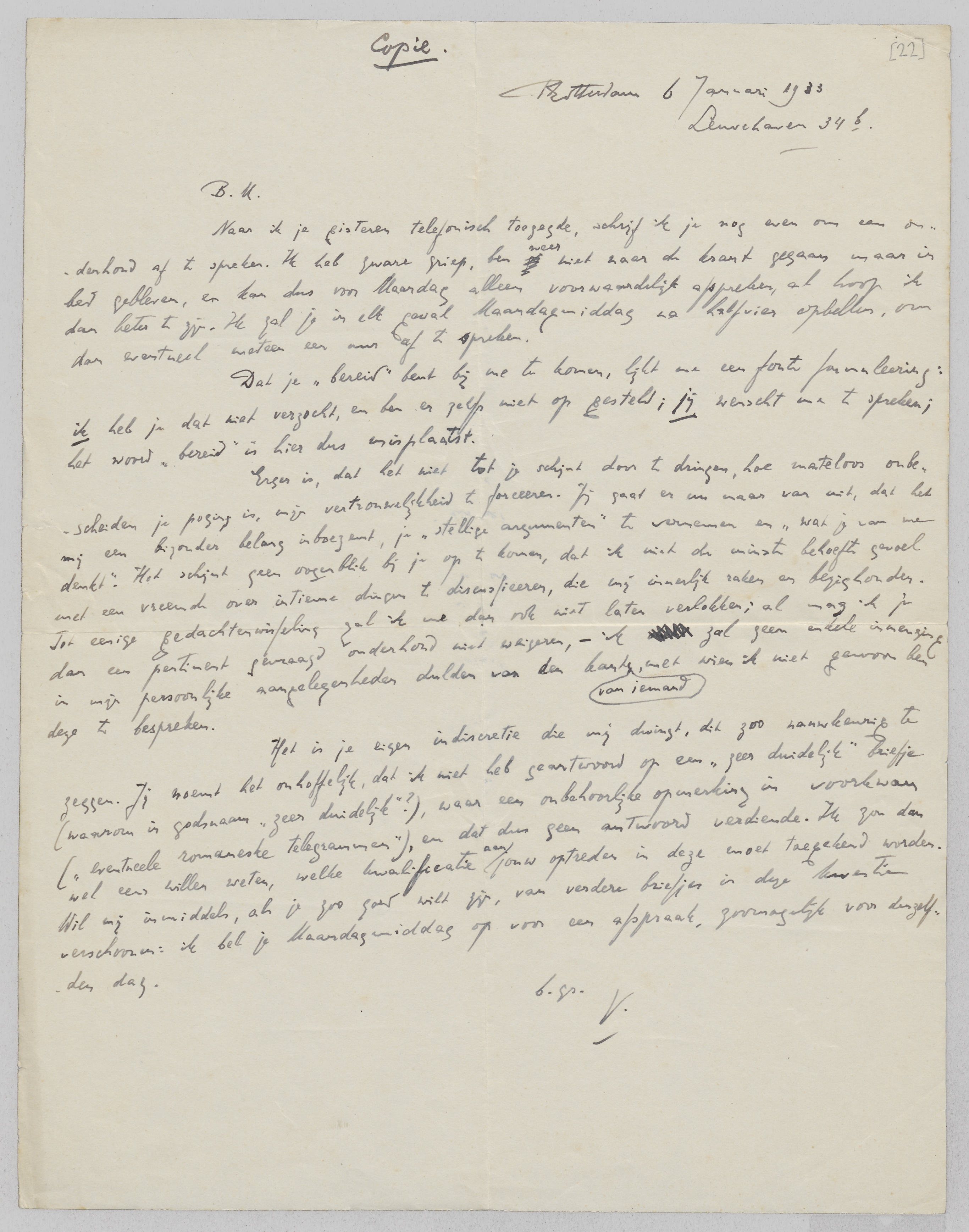 Het is je eigen indiscretie die mij dwingt, dit zoo nauwkeurig te zeggen. Jij noemt het onhoffelijk, dat ik niet heb geantwoord op een ‘zeer duidelijk’ briefje (waarom in godsnaam ‘zeer duidelijk’?), waar een onbehoorlijke opmerking in voorkwam (eventueele romaneske telegrammen), en dat dus geen antwoorde verdiende. Ik zou dan wel eens willen weten, welke kwalificatie aan jou optreden in deze moet toegekend worden. Wil mij inmiddels, als je zoo goed wilt zijn, van verdere briefjes in deze kwestie verschoonen: ik bel je Maandagmiddag op voor een afspraak, zoomogelijk voor dezelfden dag.