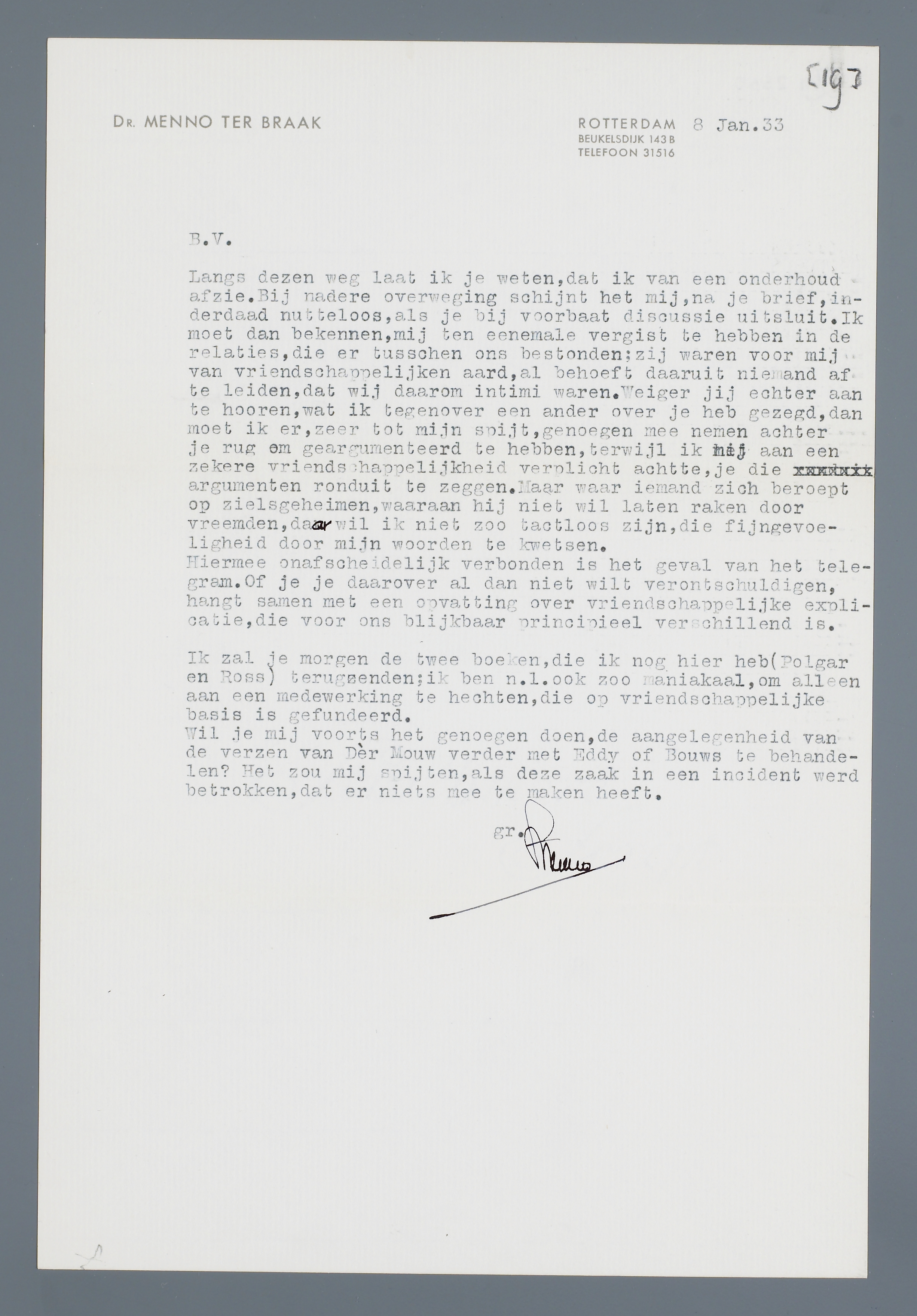 Langs dezen weg laat ik je weten, dat ik van een onderhoud afzie. Bij nadere overweging schijnt het mij, na je brief, inderdaad nutteloos, als je bij voorbaat discussie uitsluit. Ik moet dan bekennen, mij ten eenemale vergist te hebben in de relaties, die er tusschen ons bestonden; zij waren voor mij van vriendschappelijken aard, al behoeft daaruit niemand af te leiden, dat wij daarom intimi waren. Weiger jij echter aan te hooren, wat ik tegenover een ander over je heb gezegd, dan moet ik er, zeer tot mijn spijt, genoegen mee nemen achter je rug om geargumenteerd te hebben, terwijl ik mij aan een zekere vriendschappelijkheid verplicht achtte, je die argumenten ronduit te zeggen. Maar waar iemand zich beroept op zielsgeheimen, waaraan hij niet wil laten raken door vreemden, dan wil ik niet zoo tactloos zijn, die fijngevoeligheid door mijn woorden te kwetsen.