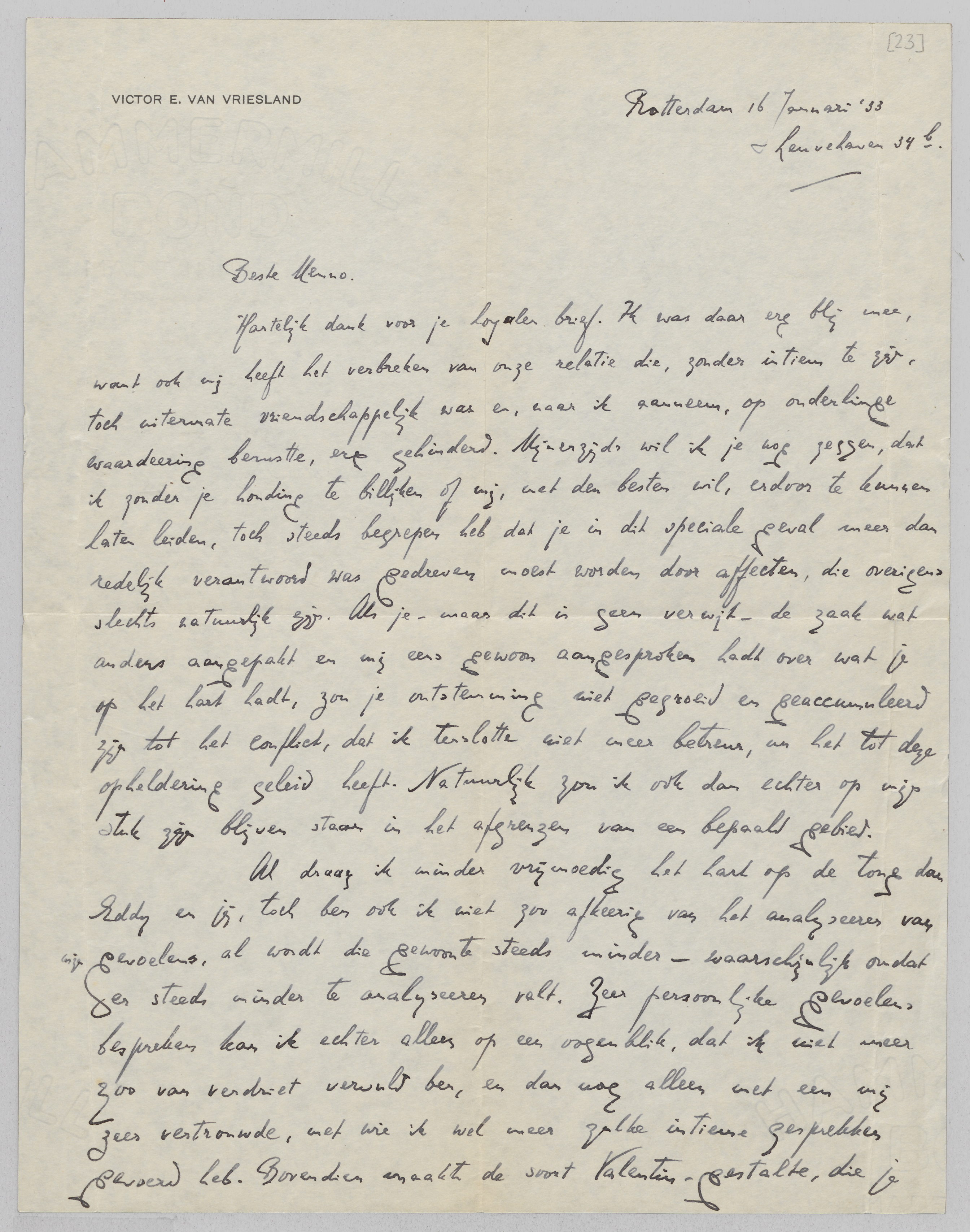 hartelijk dank voor je loyalen brief. Ik was daar erg blij mee, want ook mij heeft het verbeken van onze relatie die, zonder intiem te zijn, toch uitermate vriendschappelijk was en, naar ik aanneem, op onderlinge waardeering berustte, erg gehinderd. Mijnerzijds wil ik je nog zeggen, dat ik je zonder je houding te billijken of mij, met den besten wil, erdoor te kunnen laten leiden, toch steeds begrepen heb dat je in dit speciale geval meer dan redelijk verantwoord was gedreven moest worden door affecten, die overigen slechts natuurlijk zijn. Als je - maar dit is geen verwijt - de zaak wat anders had aangepakt en mij eens gewoon aangesproken hadt over wat je op het hart hadt, zou je ontstemming niet gegroeid en geaccumuleerd zijn tot het conflict, dat ik tenslotte niet meer betreur, nu het tot deze opheldering geleid heeft. Natuurlijk zou ik ook dan echter op mijn stuk zijn blijven staan in het afgrenzen van een bepaald gebied.
