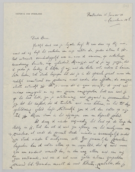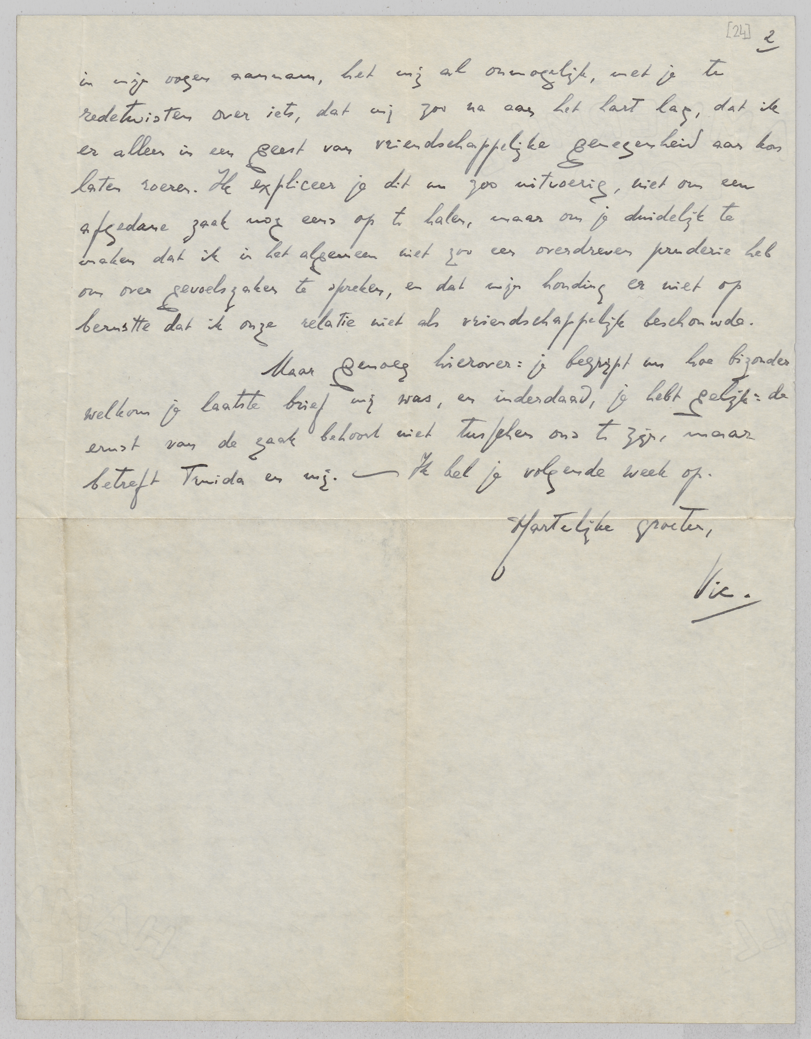 Al draag ik minder vrijmoedig het hart op de tong dan Eddy en jij, toch ben ik er ook niet zoo afkeerig van het analyseeren van mijn gevoelens, al wordt die gewoonte steeds minder - waarschijnlijk omdat er steeds minder te analyseeren valt. Zeer persoonlijke gevoelens bespreken kan ik echter alleen op een oogenblik, dat ik niet meer zoo van verdriet vervuld ben, en dan nog alleen met mijn zeer vertrouwde, met wie ik wel meer zulke intieme gesprekken gevoerd heb. Bovendien maakte de soort Valentin-gestalte, die je in mijn oogen aannam, het mij al onmogelijk, met je te redetwisten over iets, dat mij zoo na aan het hart lag, dat ik er alleen in een geest van vriendschappelijke genegenheid aan kon laten roeren. Ik expliceer je dit nu zoo uitvoerig, niet om een afgedane zaak nog eens op te halen, maar om je duidelijk te maken dat ik in het algemeen niet zoo een overdreven pruderie heb om over gevoelszaken te spreken, en dat mijn houding er niet op berustte dat ik onze relatie niet als vriendschappelijk beschouwde.