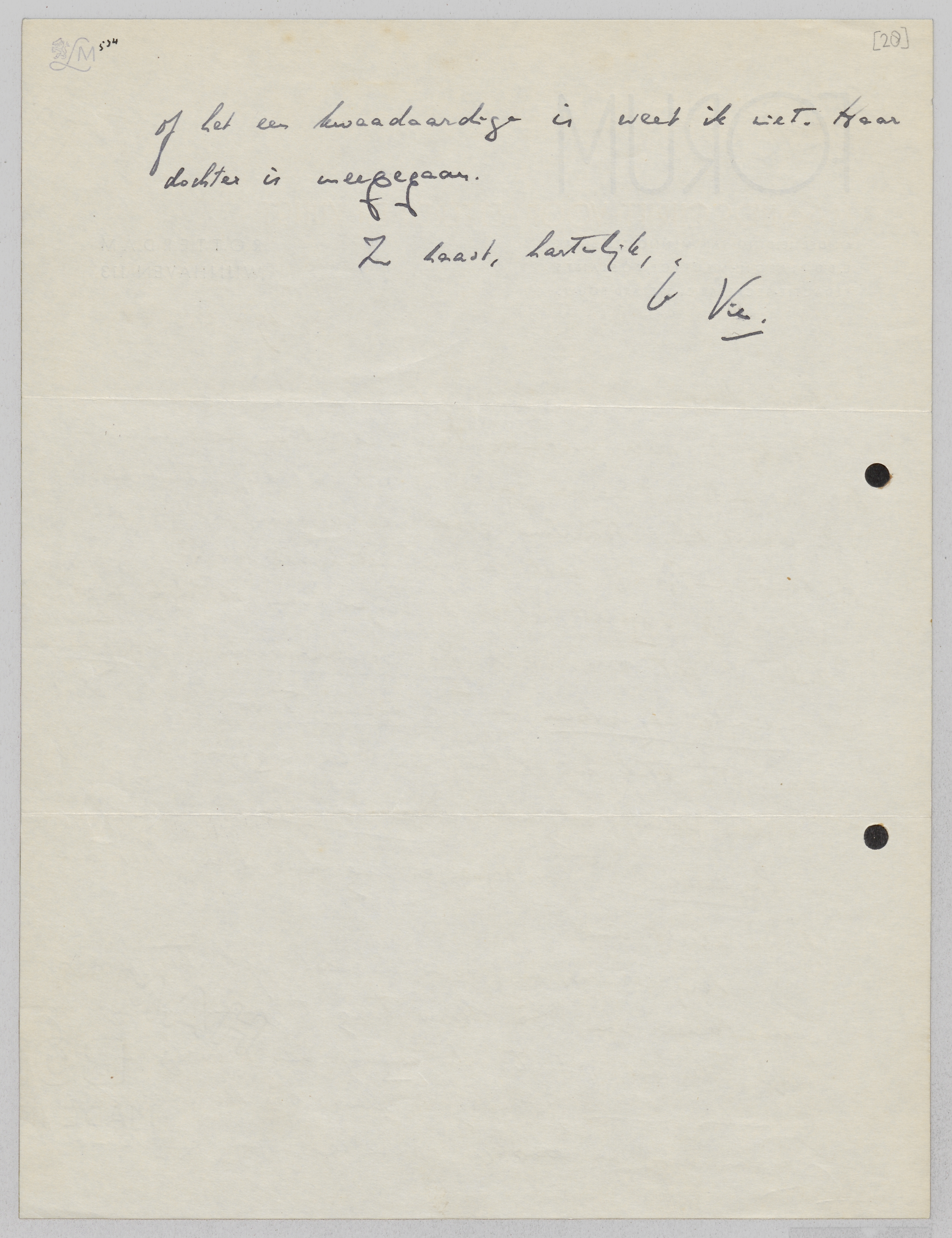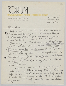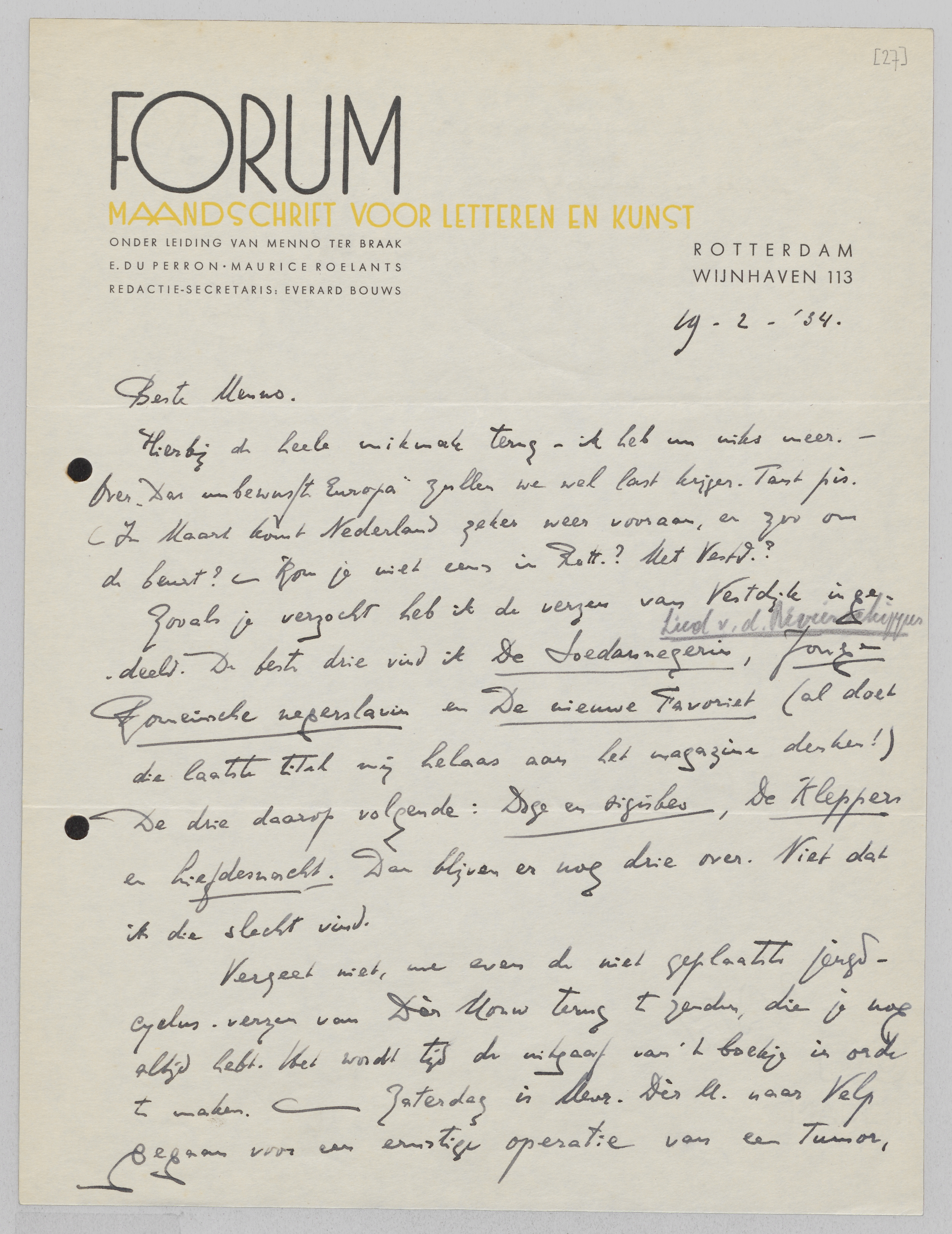 Vergeet niet, me even de niet geplaatste jeugdcyclus-verzen van Dèr Mouw terug te zenden, die je nog altijd hebt. Het wordt tijd de uitgaaf van 't boekje in orde te maken. - Zaterdag is Mevr. Dèr M. naar Velp gegaan voor een ernstige operatie van een Tumor, of het een kwaadaardige is weet ik niet. Haar dochter is meegegaan.