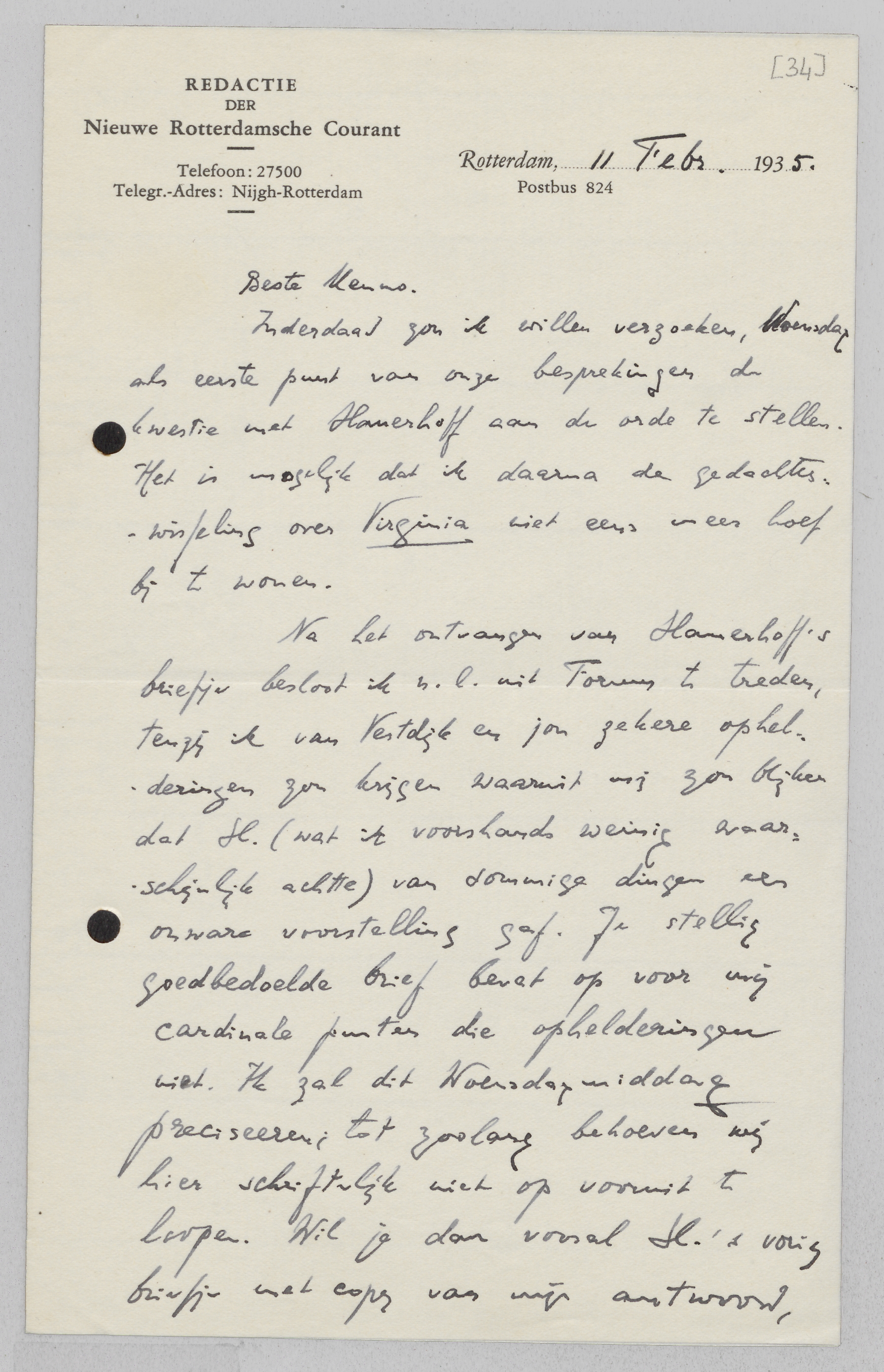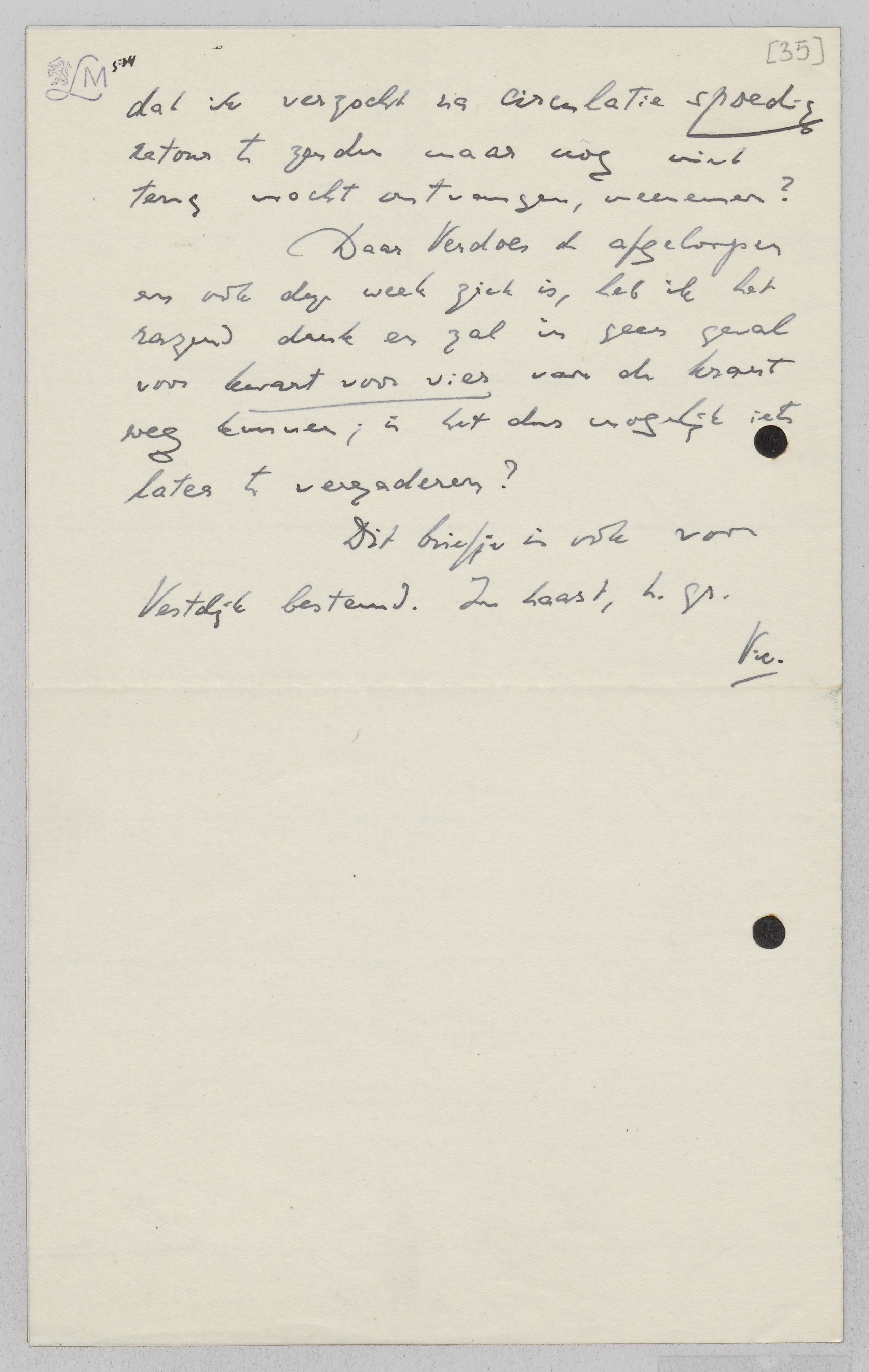Daar Verdoes de afgeloopen en ook deze week ziek is, heb ik het razend druk en zal in geen geval voor kwart voor vier van de krant weg kunnen; is het dus mogelijk iets later te vergaderen?