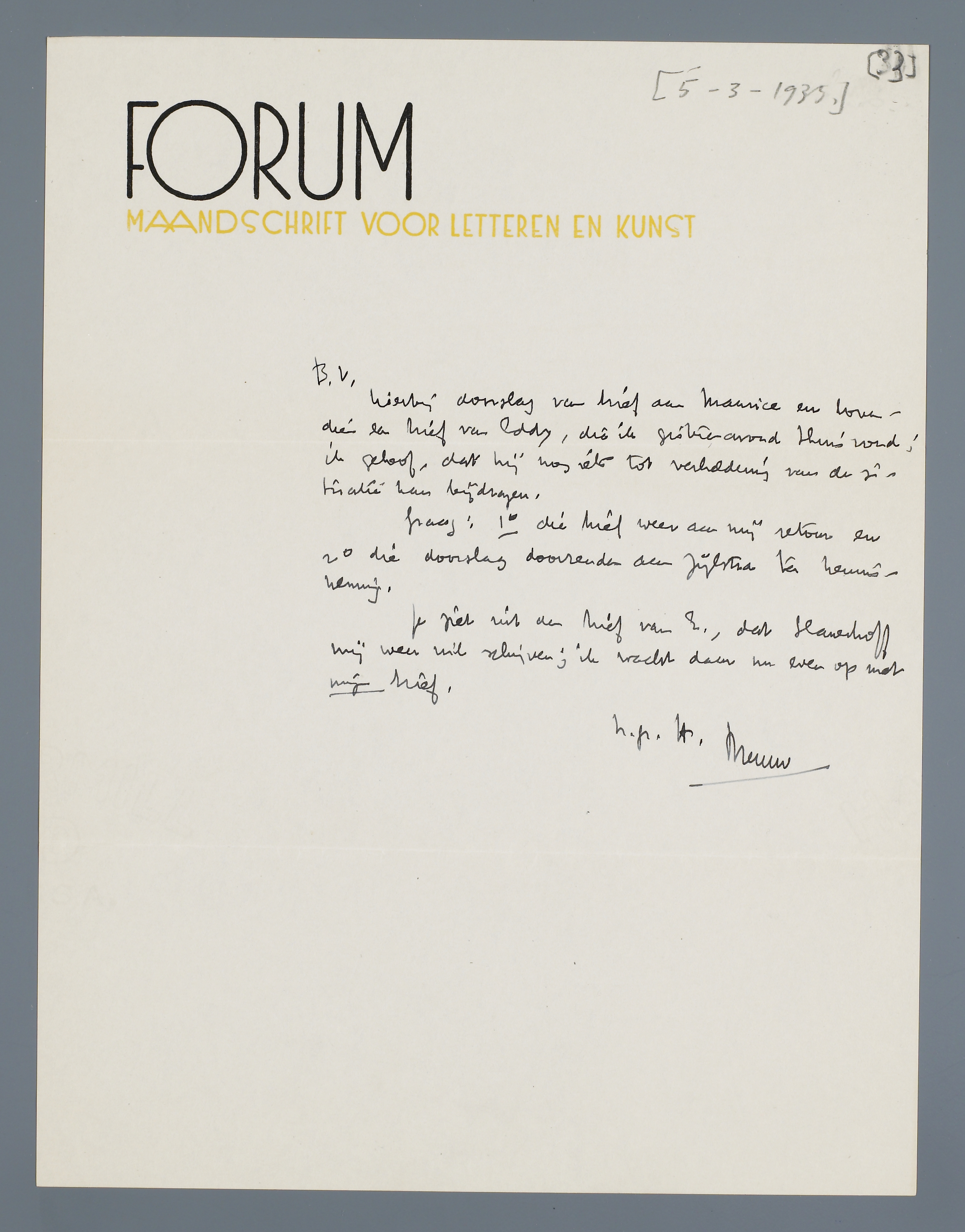 Hierbij doorslag van brief aan Maurice en bovendien een brief van Eddy, die ik gisterenavond thuis vond; ik geloof, dat hij nog iets tot verheldering van de situatie kan bijdragen.