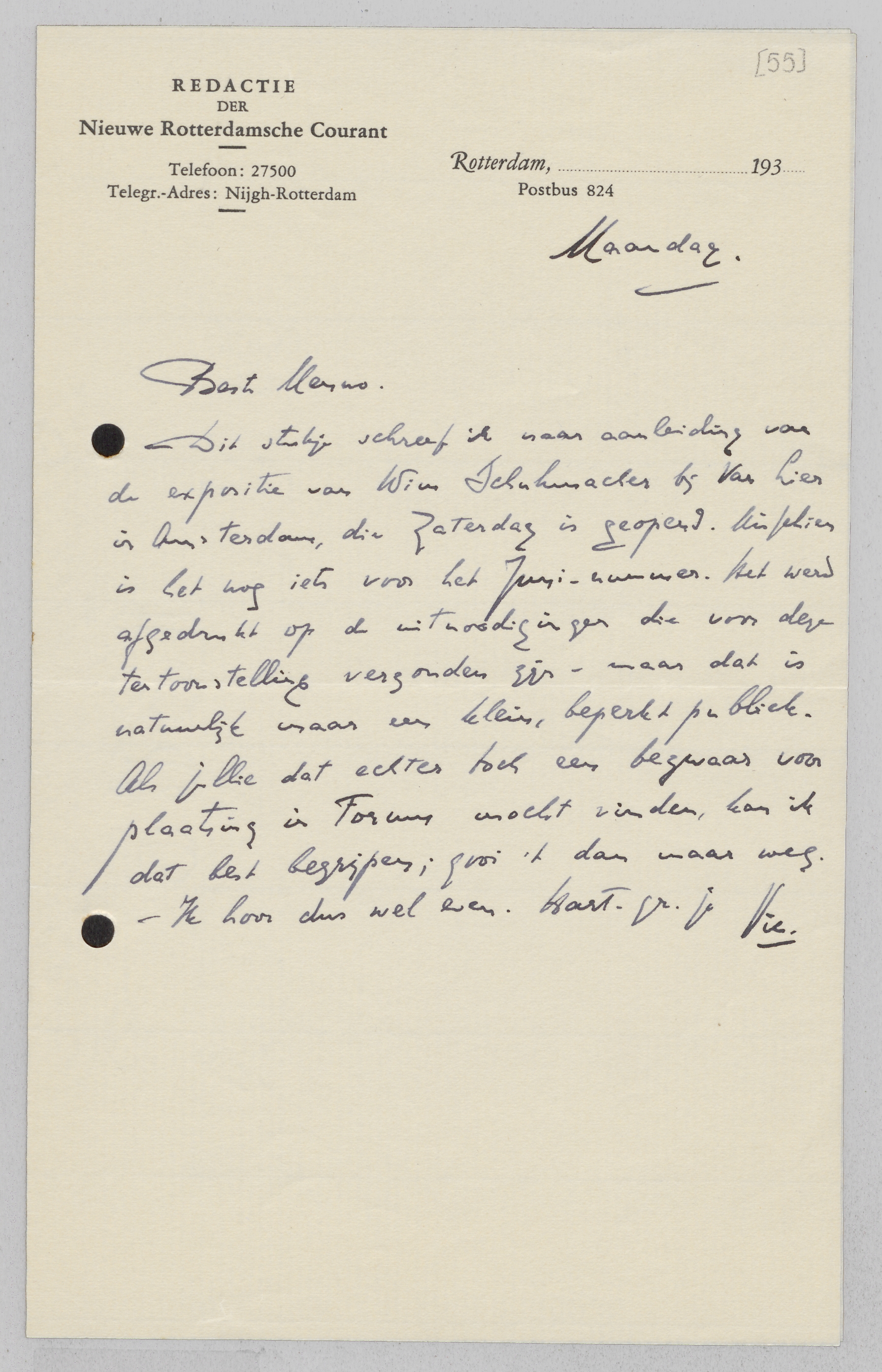 Dit stukje schreef ik naar aanleiding van de expositie van Wim Schuhmacher bij Van Lier in Amsterdam, die zaterdag is geopend. Misschien is het nog iets voor het Juni-nummer. Het werd afgedrukt op de uitnoodigingen die voor deze tentoonstelling verzonden zijn - maar dat is natuurlijk maar een klein, beperkt publiek.
