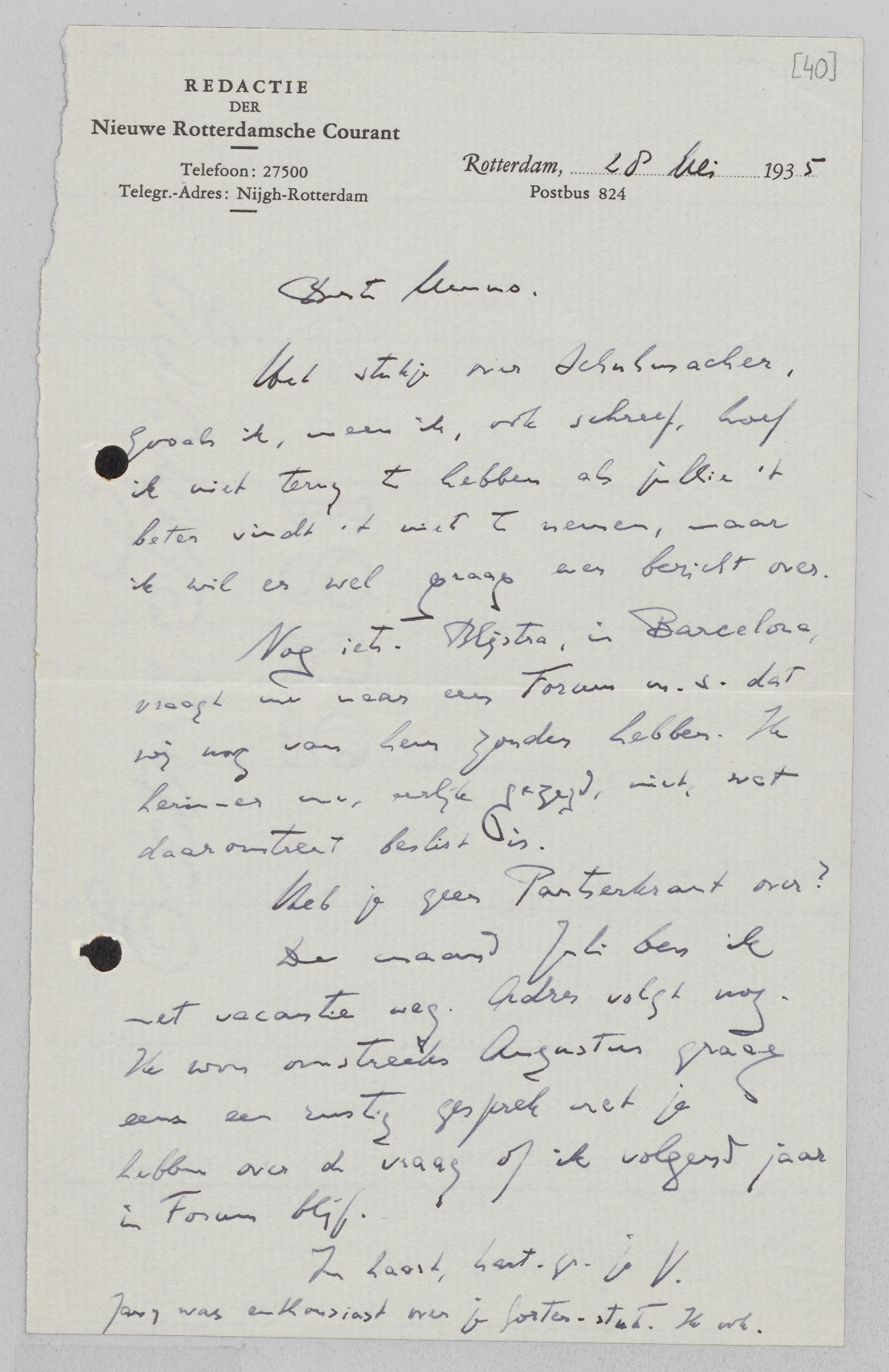 Nog iets, Blijstra, in Barcelona vraagt nu naar een Forum m.s. dat wij nog van hem zouden hebben. Ik herinner me, eerlijk gezegd, niet, wat daaromtrent beslist is.