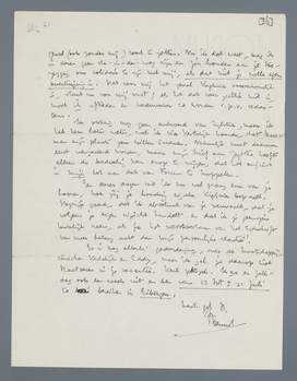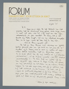 Ik heb na lang beraad mijn voornemen aan Zijlstra kenbaar gemaakt om aan het eind van het jaar als redacteur af te treden; dat ik eerst aan Zijlstra dit definitieve besluit meedeelde, heeft een bijzondere reden. In de eerste plaats ken jij mijn motieven al: 1o algemeene ‘vermoeidheid’, 2o de Virginia-quaestie, die voor mij absoluut onoverkomelijk is. In dezen brief aan Zijlstra heb ik hem verzocht geen verband te leggen tusschen dit aftreden van mij persoonlijk en het staken van de uitgave. Immers: hoezeer ik het ook apprecieer, dat jij je solidair met mij hebt verklaard inzake Virginia, ik weet, dat je (gegeven de publicatiegelegenheid in de Vrije Bladen) van deze zaak geen kabinetsquaestie wilt maken /volgens je eigen overtuiging/. Vestdijk is, zooals mij bleek na zijn terugkomst, geneigd Forum in ieder geval (ook zonder mij) voort te zetten. Nu ik dat weet, mag ik in dezen geen sta-in-den-weg zijn en jou houden aan je toezegging om solidair te zijn met mij, als dat niet je volle eigen overtuiging is. Dat voor mij het geval Virginia onoverkomelijk is, staat nu voor mij vast; als het dat voor jullie niet is, moet ik aftreden en medewerker te worden i.p.v. redacteur.