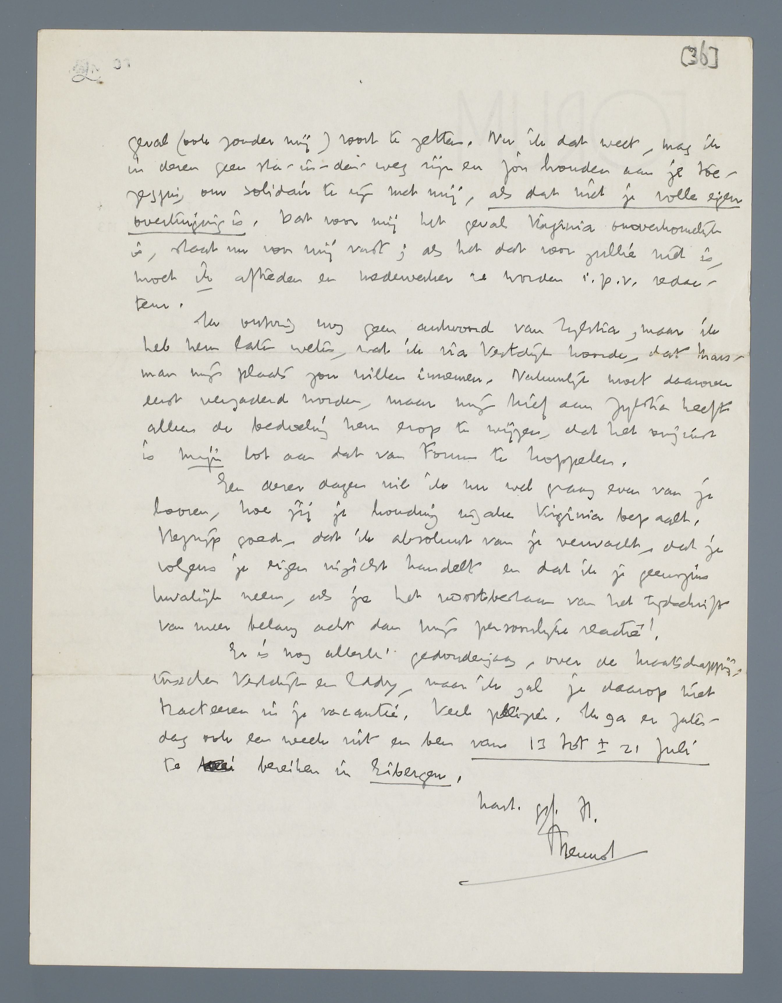 Een dezer dagen wil ik nu wel graag even van je hooren, hoe jij je houding inzake Virginia bepaalt. Begrijp goed, dat ik absoluut van je verwacht, dat je volgens je eigen inzicht handelt en dat ik je geenszins kwalijk neem, als je het voortbestaan van het tijdschrift van meer belang acht dan mijn persoonlijke reactie!