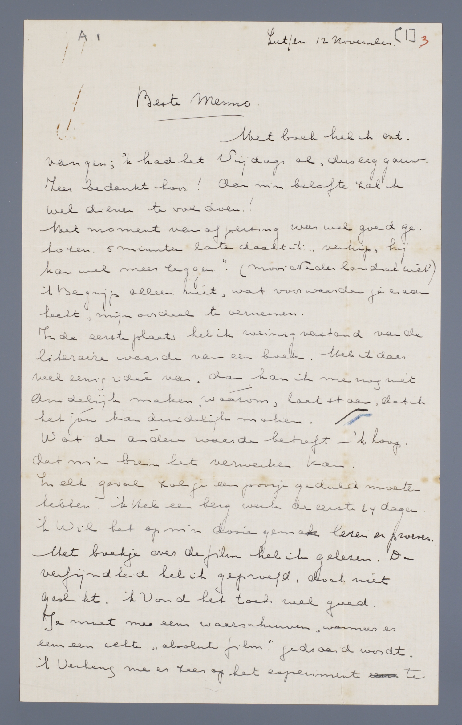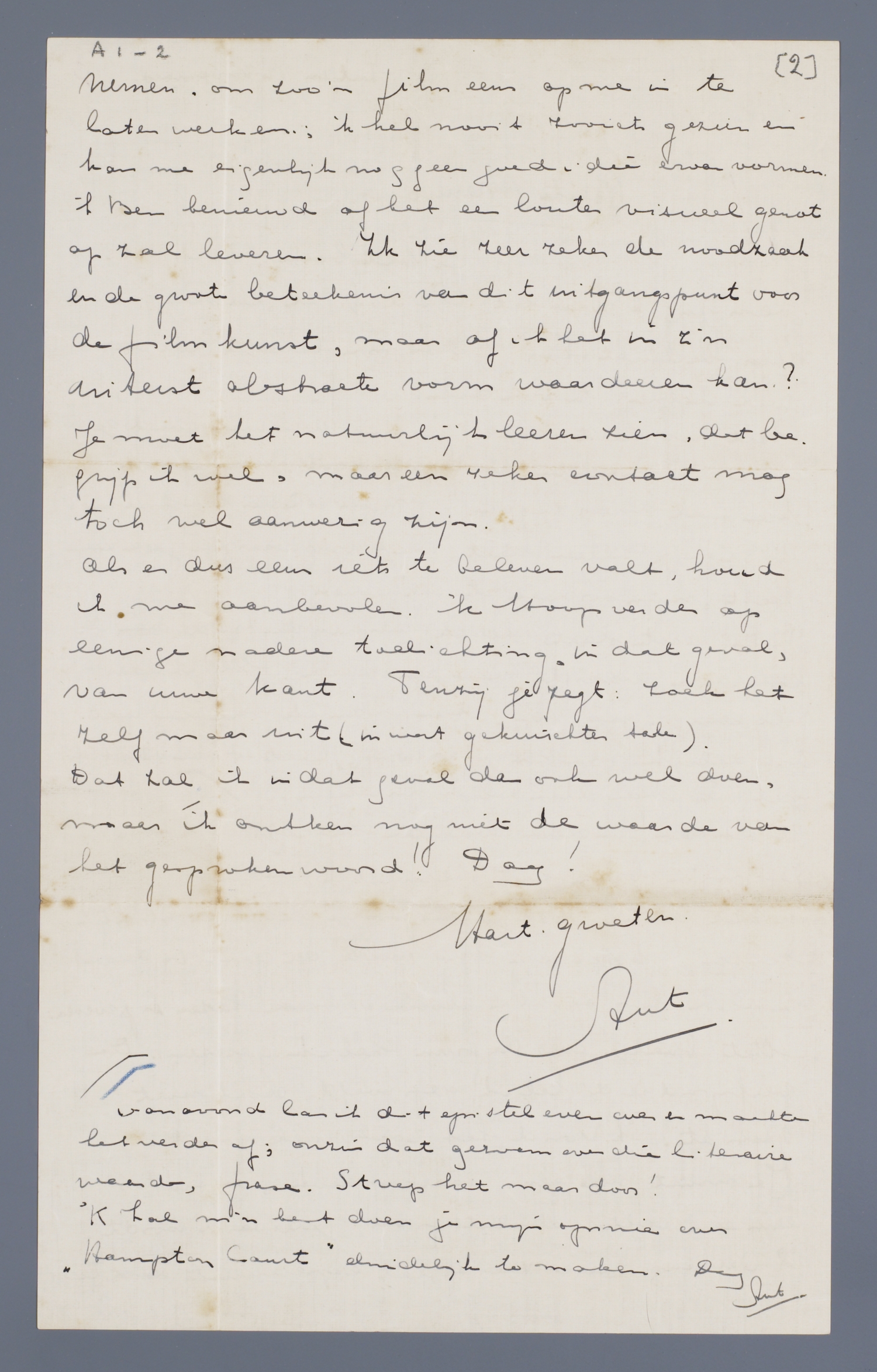Je moet me eens waarschuwen, wanneer er eens een echte ‘absolute film’ gedraaid wordt. 'k Verheug me er zeer op het experiment te nemen, om zoo'n film eens op me in te laten werken; 'k heb nooit zooiets gezien en kan me eigenlijk nog geen goed idee ervan vormen. 'k Ben benieuwd of het een louter visueel genot op zal leveren. Ik zie zeer zeker de noodzaak en de groote beteekenis van dit uitgangspunt voor de filmkunst, maar of ik het in z'n uiterst abstracte vorm waardeeren kan? Je moet het natuurlijk leeren zien, dat begrijp ik wel, maar een zeker contact mag toch wel aanwezig zijn.