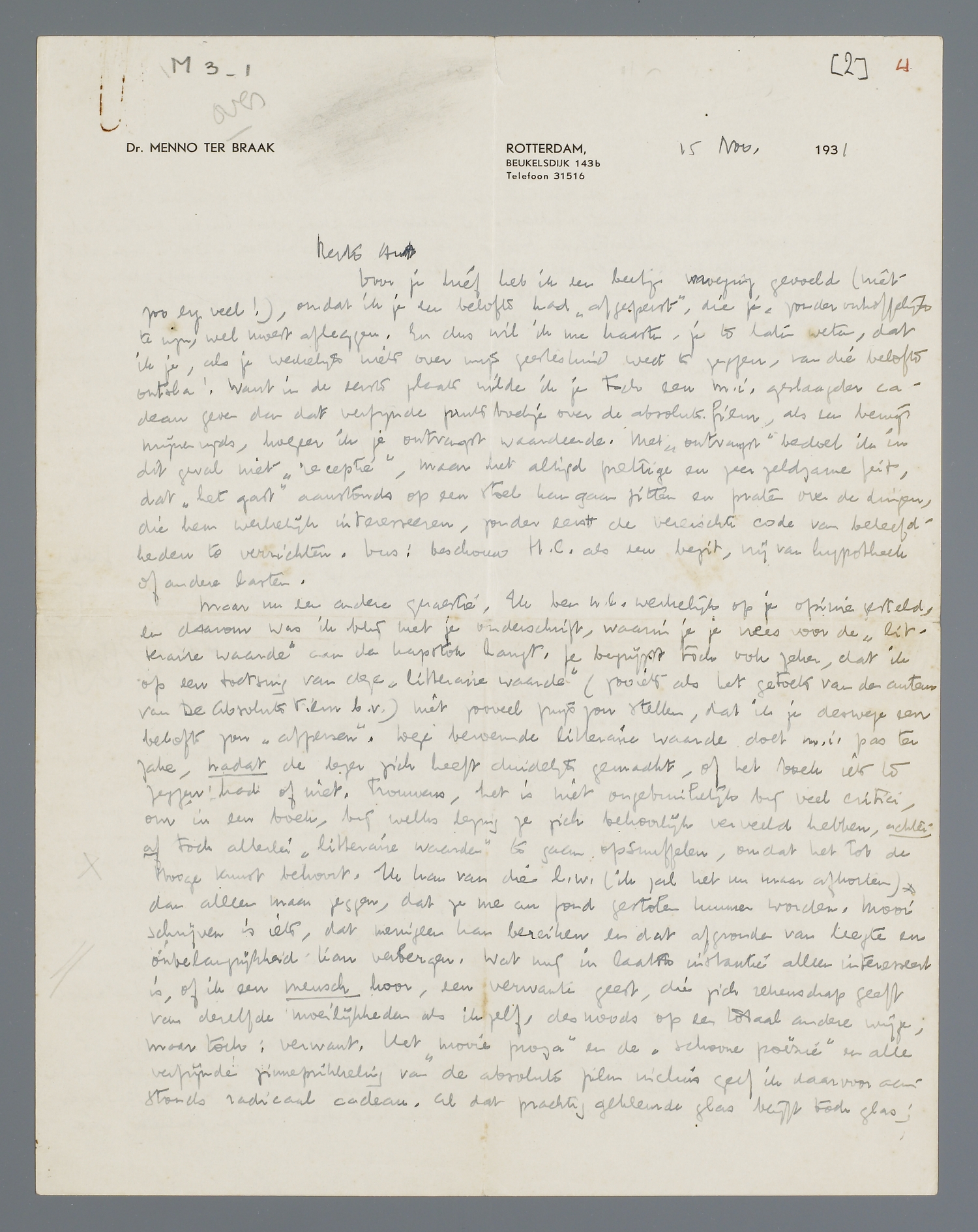Maar nu een andere quaestie. Ik ben n.l. werkelijk op je opinie gesteld, en daarom was ik blij met je onderschrift, waarin je je vrees voor de ‘litteraire waarde’ aan den kapstok hangt. Je begrijpt toch ook zeker, dat ik op een toetsing van deze ‘litteraire waarde’ (zooiets als het getoets van den auteur van De Absolute Film b.v.) niet zooveel prijs zou stellen, dat ik je deswege een belofte zou ‘afpersen’. Deze beroemde litteraire waarde doet m.i. pas ter zake, nadat de lezer zich heeft duidelijk gemaakt, of het boek iets te zeggen had of niet. Trouwens, het is niet ongebruikelijk bij veel critici, om in een boek, bij welks lezing ze zich behoorlijk verveeld hebben, achteraf toch allerlei ‘litteraire waarden’ te gaan opsnuffelen, omdat het tot de Hooge Kunst behoort. Ik kan van die l.w. (ik zal het nu maar afkorten) dan alleen maar zeggen, dat ze me au fond gestolen kunnen worden. Mooi schrijven is iets, dat menigeen kan bereiken en dat afgronden van leegte en onbelangrijkheid kan verbergen. Wat mij in laatste instantie alleen interesseert is, of ik een mensch hoor, een verwante geest, die zich rekenschap geeft van dezelfde moeilijkheden als ik zelf, desnoods op een totaal andere wijze; maar toch: verwant. Het ‘mooie proza’ en de ‘schoone poëzie’ en alle verfijnde zinneprikkeling van de absolute film incluis geef ik daarvoor aanstonds radicaal cadeau. Al dat prachtig gekleurde glas blijft toch glas; maar de stem van een persoonlijkheid, die sentimentaliteit versmaadt en helderheid eischt, is mij dierbaar. Je denkt misschien, dat ik een beetje met mijn eigen mooi geïllustreerde boekje over de film coquetteer. Dat is toch niet waar; ik erken, dat het een goed pleidooi is en goed geschreven, maar het is het geschrift van een aestheet, die zich niet afvraagt, of de schoonheid en haar verfijning werkelijk de eeredienst noodig heeft, die de aestheten haar willen offreeren. Dat definieeren van filmsensaties vergelijk ik zelf met het deskundig opsnuiven van resp. aspergesoep, champignonsoep, tomatensoep, kippesoep. Het is een soort kokswerk, waar iedereen, die niet persé grof wil blijven, doorheen moet; maar hij moet er ook doorheen, en de aestheten die in de soepsnuiverij verstarren, zijn onaangename aanstellers, die zich verheven voelen boven de rest van het menschdom. Ik coquetteer dus niet, als ik zeg, dat ik het boekje over de absolute film absoluut verwerp, misschien wel juist om zijn qualiteiten.