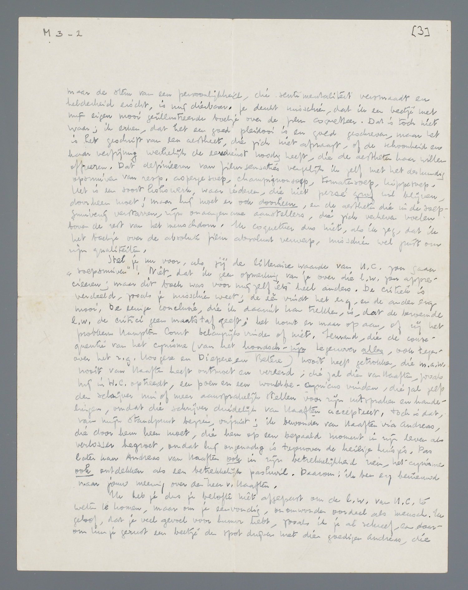 Stel je nu voor, als jij de litteraire waarde van H.C. zou gaan ‘soepsnuiven’! Niet, dat ik geen opmerking van je over de l.w. zou apprecieeren; maar dit boek was voor mij zelf iets heel anders. De critiek is verdeeld, zooals je misschien weet; de één vindt het erg, en de ander erg mooi. De eenige conclusie, die ik daaruit kan trekken, is, dat de beroemde l.w. de critiek geen maatstaf geeft; het komt er maar op aan, of zij het probleem Hampton Court belangrijk vinden of niet. Iemand, die de consequentie van het cynisme (van het hondsch-zijn tegenover alles, ook tegenover het z.g. Hoogere en Diepere en Betere) nooit heeft getrokken, die m.a.w. nooit van Haaften heeft ontmoet en vereerd; die zal dien van Haaften, zooals hij in H.C. optreedt, een poen en een would be-cynicus vinden, die zal zelfs den schrijver min of meer aansprakelijk stellen voor zijn uitspraken en handelingen, omdat die schrijver duidelijk van Haaften accepteert. Toch is dat, van mijn standpunt bezien, onjuist; ik bewonder van Haaften via Andreas, die door hem heen moet, die hem op een bepaald moment in zijn leven als verlosser begroet, omdat hij ongenadig is tegenover de heilige huisjes. Pas later kan Andreas van Haaften ook in zijn betrekkelijkheid zien, het cynisme ook ontdekken als een betrekkelijk paskwil. Daarom: ik ben erg benieuwd naar jouw mening over den heer van Haaften.