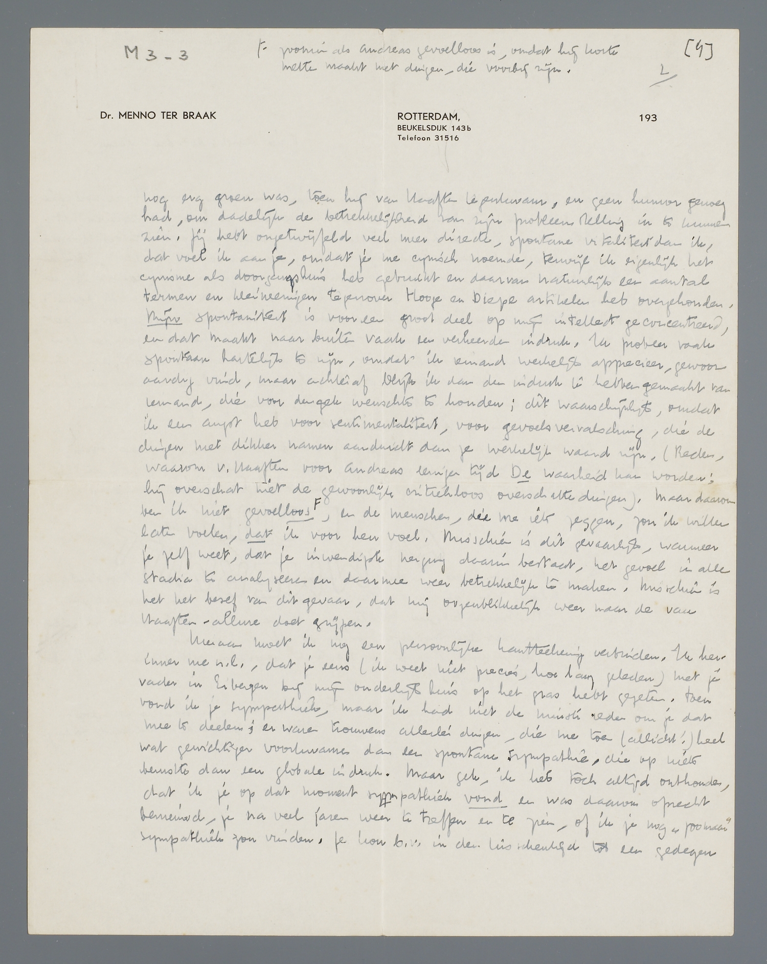Ik heb je dus je belofte niet afgeperst om de l.w. van H.C. te weten te komen, maar om je eenvoudig, onomwonden oordeel als mensch. Ik geloof, dat je veel gevoel voor humor hebt, zooals ik je al schreef, en daarom kun je gerust een beetje den spot drijven met dien goedigen Andreas, die nog erg groen was, toen hij van Haaften tegenkwam, en geen humor genoeg had, om dadelijk de betrekkelijkheid van zijn probleemstelling in te kunnen zien. Jij hebt ongetwijfeld veel meer directe, spontane vitaliteit dan ik, dat voel ik aan je, omdat je me cynisch noemde, terwijl ik eigenlijk het cynisme als doorgangshuis heb gebruikt en daarvan natuurlijk een aantal termen en kleineeringen tegenover Hooge en Diepe artikelen heb overgehouden. Mijn spontaniteit is voor een groot deel op mijn intellect geconcentreerd, en dat maakt naar buiten vaak een verkeerden indruk. Ik probeer vaak spontaan hartelijk te zijn, omdat ik iemand werkelijk apprecieer, gewoon aardig vind, maar achteraf blijk ik dan den indruk te hebben gemaakt van iemand, die voor den gek wenschte te houden; dit waarschijnlijk, omdat ik een angst heb voor sentimentaliteit, voor gevoelsvervalsching, die de dingen met dikker namen aanduidt dan ze werkelijk waard zijn.(Reden, waarom v. Haaften voor Andreas eenigen tijd De waarheid kan worden; hij overschat niet de gewoonlijk critiekloos overschatte dingen). Maar daarom ben ik niet gevoelloos