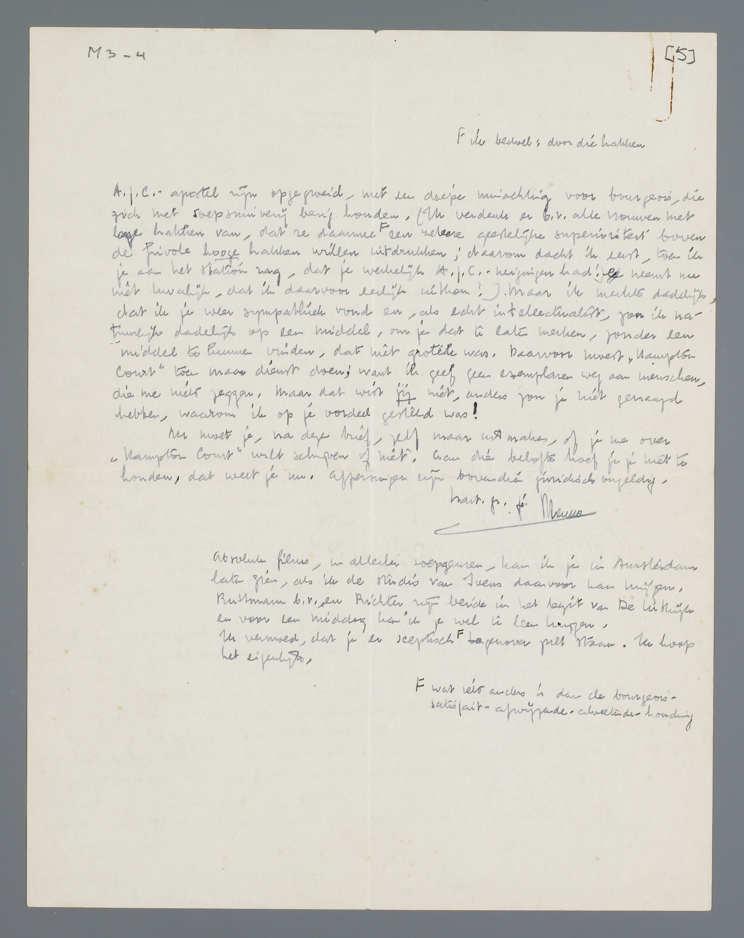Hieraan moet ik nog een persoonlijke kantteekening verbinden. Ik herinner me n.l., dat je eens (ik weet niet precies, hoe lang geleden) met je vader in Eibergen bij mijn ouderlijk huis op het gras hebt gezeten. Toen vond ik je sympathiek, maar ik had niet de minste reden om je dat mee te deelen; er waren trouwens allerlei dingen, die me toen (allicht!) heel wat gewichtiger voorkwamen dan een spontane sympathie, die op niets berustte dan een globale indruk. Maar gek, ik heb toch altijd onthouden, dat ik je op dat moment sympathiek vond en was daarom oprecht benieuwd, je na veel jaren weer te treffen en te zien, of ik je nog ‘zoomaar’ sympathiek zou vinden. Je kon b.v. in den tusschentijd tot een gedegen A.J.C.-apostel zijn opgegroeid, met een diepe minachting voor bourgeois, die zich met soepsnuiverij bezig houden. (Ik verdenk er b.v. alle vrouwen met lage hakken van, dat ze daarmee <ik bedoel: door die hakken> een zekere geestelijke superioriteit boven de frivole hooge hakken willen uitdrukken; daarom dacht ik eerst, toen ik je aan het station zag, dat je werkelijk A.J.C.-neigingen had! (Je neemt me niet kwalijk, dat ik daarvoor eerlijk uitkom!) Maar ik merkte dadelijk, dat ik je weer sympathiek vond en, als echt intellectualist, zon ik natuurlijk dadelijk op een middel, om je dat te laten merken, zonder een middel te kunnen vinden, dat niet grotesk was. Daarvoor moest ‘Hampton Court’ toen maar dienst doen; want ik geef geen exemplaren weg aan menschen, die me niets zeggen. Maar dat wist jij niet, anders zou je niet gevraagd hebben, waarom ik op je oordeel gesteld was!