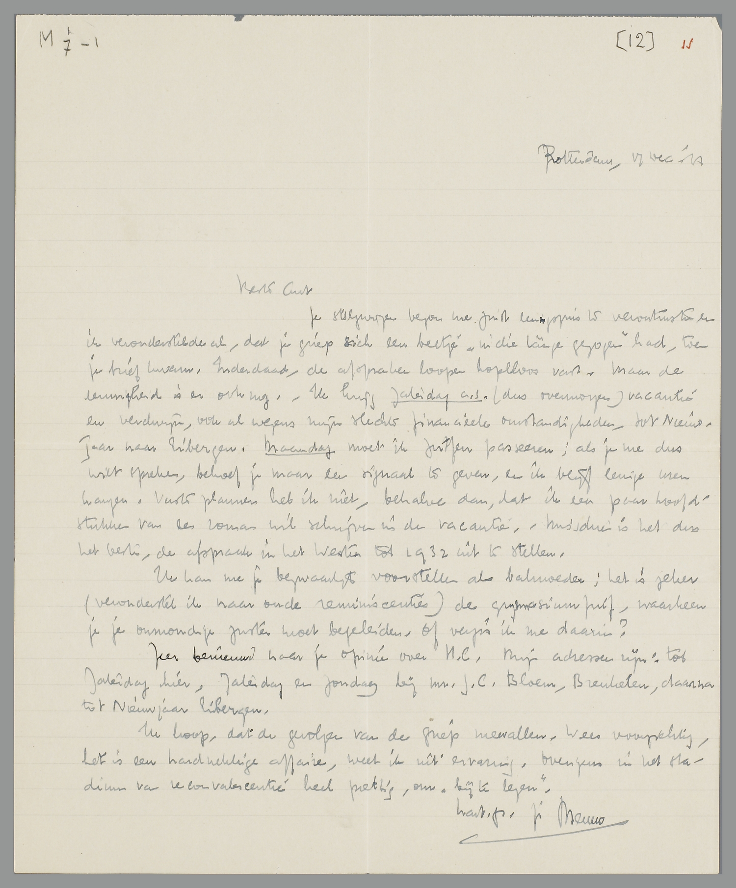Je stilzwijgen begon me juist eenigszins te verontrusten, ik veronderstelde al, dat je griep zich een beetje ‘in die länge gezogen’ had, toen je brief kwam. Inderdaad, de afspraken loopen hopeloos vast. Maar de eeuwigheid is er ook nog. - Ik krijg Zaterdag a.s. (dus overmorgen) vacantie en verdwijn, ook al wegens mijn slechte financieele omstandigheden, tot Nieuw Jaar naar Eibergen. Maandag moet ik Zutfen passeeren; als je me dus wilt spreken, behoef je maar een signaal te geven, en ik blijf eenige uren hangen. Vaste plannen heb ik niet, behalve dan, dat ik een paar hoofdstukken van een roman wil schrijven in de vacantie. - Misschien is het dus het beste, de afspraak in het Westen tot 1932 uit te stellen.