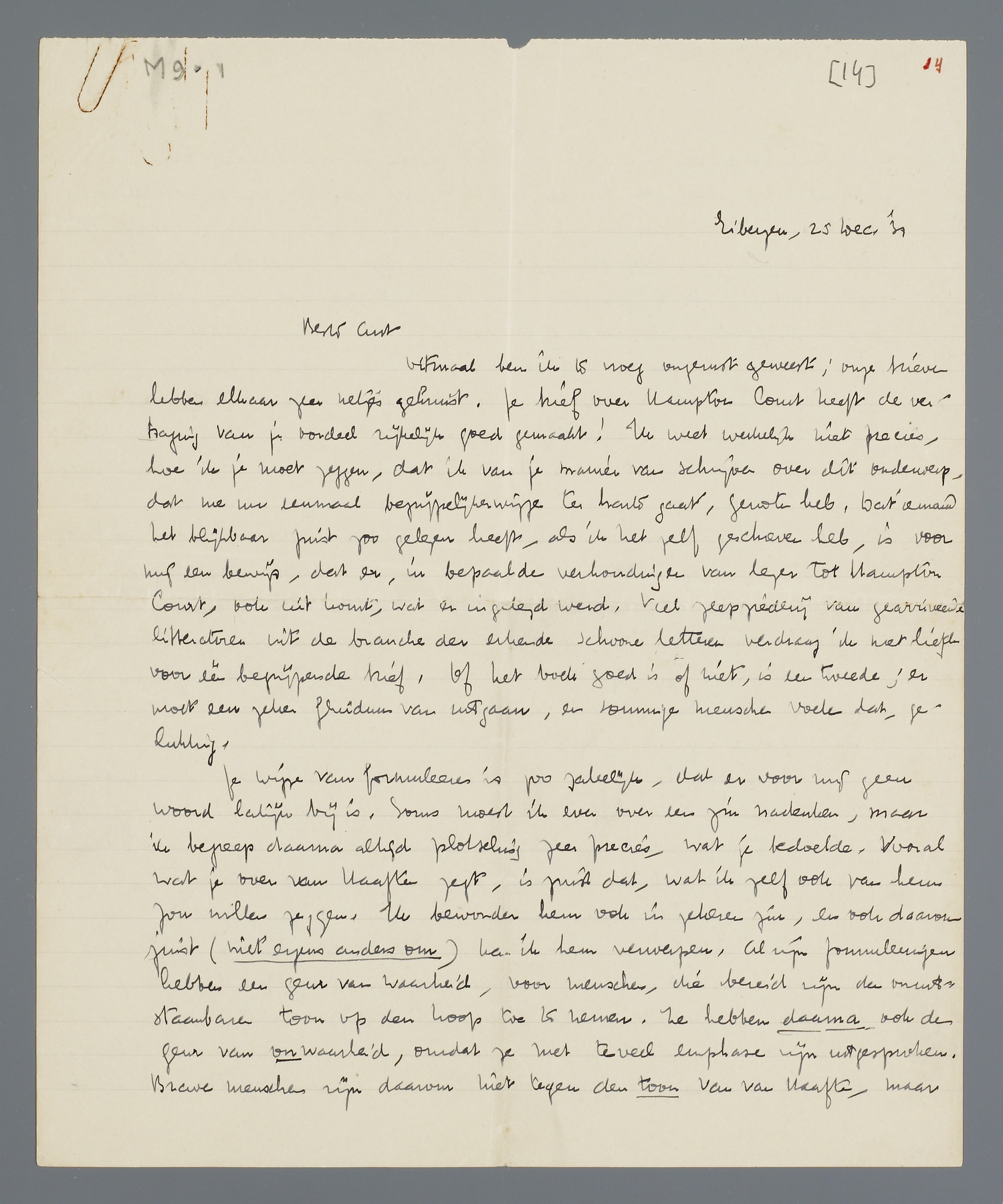Ditmaal ben ik te vroeg ongerust geweest; onze brieven hebben elkaar zeer netjes gekruist. Je brief over Hampton Court heeft de vertraging van je oordeel rijkelijk goed gemaakt! Ik weet werkelijk niet precies, hoe ik je moet zeggen, dat ik van je manier van schrijven over dit onderwerp, dat me nu eenmaal begrijpelijkerwijze ter harte gaat, genoten heb. Dat iemand het blijkbaar juist zoo gelezen heeft, als ik het zelf geschreven heb, is voor mij een bewijs, dat er, in bepaalde verhoudingen van lezer tot Hampton Court, ook uit komt, wat er in gelegd werd. Veel zeepziederij van gearriveerde litteratoren uit de branche der erkende schoone letteren verdraag ik met liefde voor één begrijpende brief. Of het boek goed is of niet, is een tweede; er moet een zeker fluïdum van uitgaan, en sommige menschen voelen dat, gelukkig.