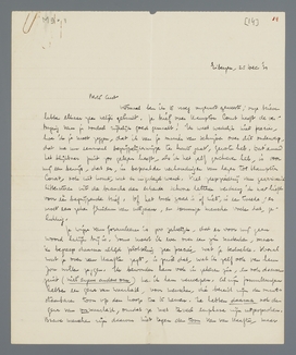 Je wijze van formuleeren is zoo zakelijk, dat er voor mij geen woord latijn bij is. Soms moest ik even over een zin nadenken, maar ik begreep daarna altijd plotseling zeer precies, wat je bedoelde. Vooral wat je over van Haaften zegt, is juist dat, wat ik zelf ook van hem zou willen zeggen. Ik bewonder hem ook in zekeren zin, en ook daarom juist (niet ergens anders om) kan ik hem verwerpen. Al zijn formuleeringen hebben een geur van waarheid, voor menschen, die bereid zijn den onuitstaanbaare toon op den koop toe te nemen. Ze hebben daarna ook den geur van onwaarheid, omdat ze met teveel emphase zijn uitgesproken. Brave menschen zijn daarom niet tegen den toon van van Haaften, maar tegen den inhoud van zijn stellingen. Zij vinden de maatschappij heelemaal niet imbeciel, het geloof ook zoo gek nog niet, een professor een respectabel man etc. etc., in plaats van er zich rekenschap van te geven, dat van Haaften gelijk heeft en daarom pas weer ongelijk. Want: is alles imbeciel etc., dan is er geen reden meer, zichzelf uit te zonderen, dan is er niet eens reden meer, het woord ‘imbeciel’ te gebruiken, omdat er geen maatstaf van het tegengestelde is.