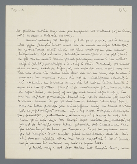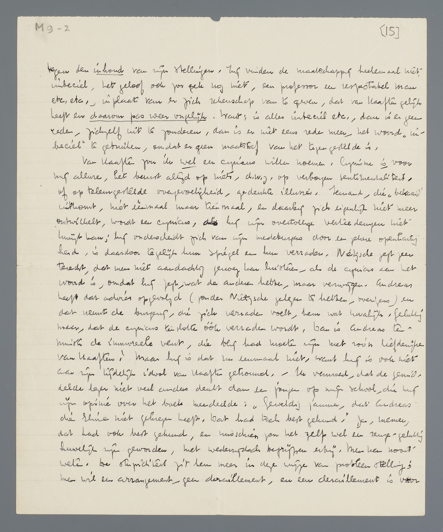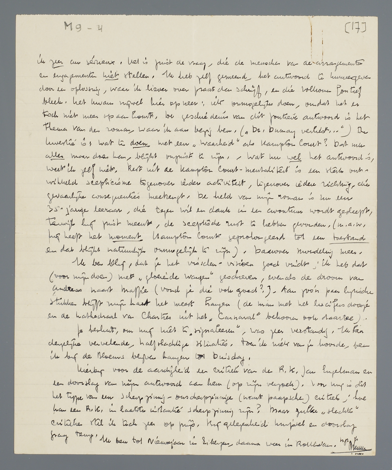 Je laatste vraag: wat doet Andreas met Hampton Court, neem ik zeer au sérieux. Het is juist de vraag, die de menschen van de arrangements en engagementen niet stellen. Ik heb zelf gemeend, het antwoord te kunnen geven door een oplossing, waar ik liever over praat dan schrijf, en die volkomen foutief bleek. Het kwam vrijwel hier op neer: iets onmogelijks doen, omdat het er toch niet meer op aan komt. De geschiedenis van dit foutieve antwoord is het thema van de roman, waar ik aan bezig ben. (‘Dr. Dumay verliest...’) De kwestie is: wat te doen met een ‘waarheid’ als Hampton Court? Dat men alles maar doen kan, blijkt onjuist te zijn. - Wat nu wel het antwoord is, weet ik zelf niet. Rest uit de Hampton Court-mentaliteit is een sterk ontwikkeld scepticisme tegenover iedere activiteit, tegenover iedere richting, die gevaarlijke consequenties meebrengt. De held van mijn roman is nu een 35-jarige leeraar, die tegen wil en dank in een avontuur wordt gesleept, terwijl hij juist meent, de sceptische rust te hebben gevonden. (M.a.w. hij heeft het moment Hampton Court geprolongeerd tot een toestand en dat blijkt natuurlijk onmogelijk te zijn). Daarover mondeling meer.