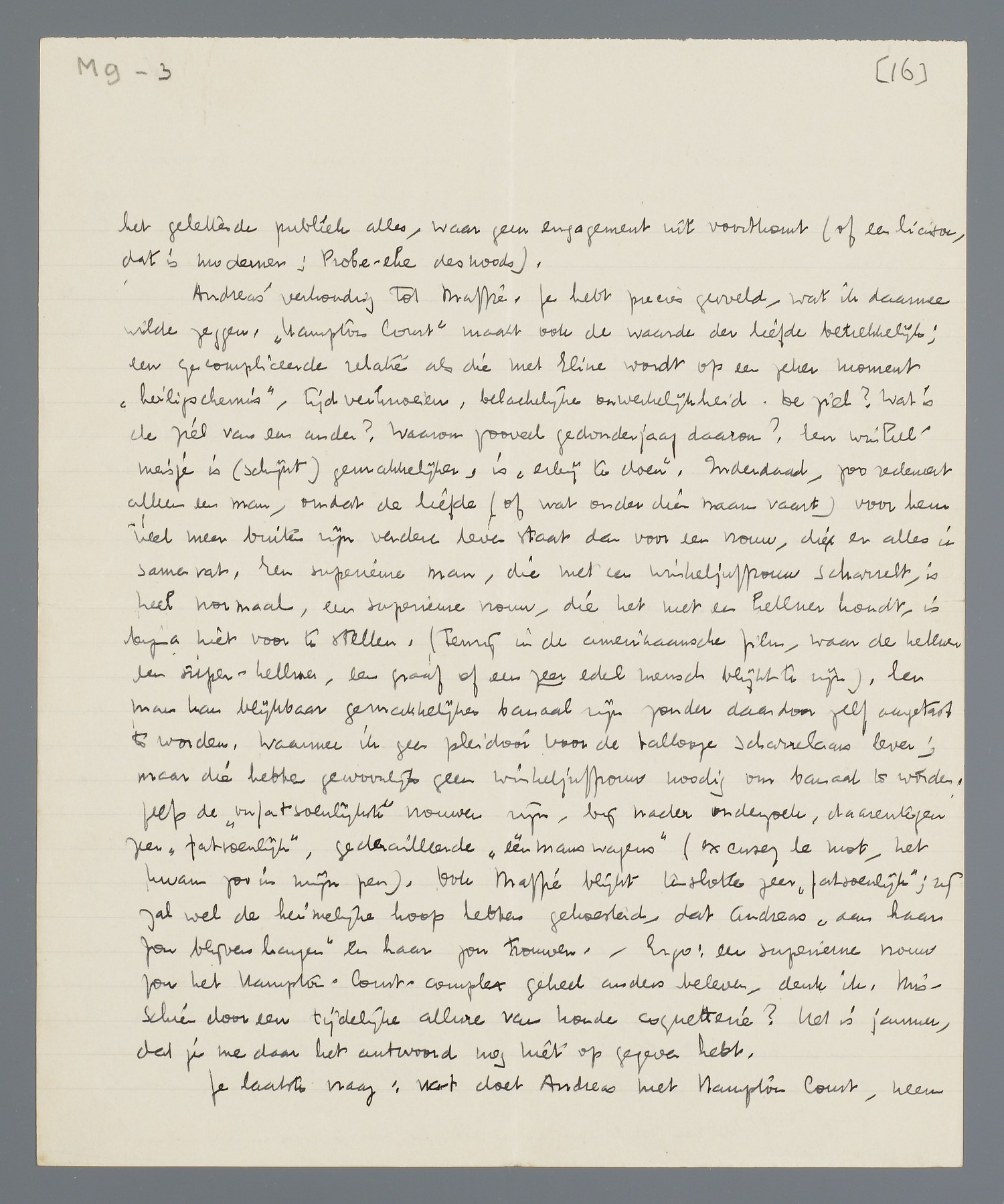 Andreas' verhouding tot Maffie. Je hebt precies gevoeld, wat ik daarmee wilde zeggen. ‘Hampton Court’ maakt ook de waarde der liefde betrekkelijk; een gecompliceerde relatie als die met Eline wordt op een zeker moment ‘heiligschennis’, tijdverknoeien, belachelijke onwerkelijkheid. De ziel? Wat is de ziel van een ander? Waarom zooveel gedonderjaag daarom? Een winkelmeisje is (schijnt) gemakkelijker, is ‘erbij te doen’. Inderdaad, zoo redeneert alleen een man, omdat de liefde (of wat onder dien naam vaart) voor hem vaak meer buiten zijn verdere leven staat dan voor een vrouw, die er alles in samen vat. Een superieure man, die met een winkeljuffrouw scharrelt, is heel normaal, een superieure vrouw, die het met een kellner houdt, is bijna niet voor te stellen. (Tenzij in de amerikaansche film, waar de kellner een super-kellner, een graaf of een zeer edel mensch blijkt te zijn). Een man kan blijkbaar gemakkelijker banaal zijn zonder daardoor zelf aangetast te worden. Waarmee ik geen pleidooi voor de tallooze scharrelaars lever; maar die hebben gewoonlijk geen winkeljuffrouw noodig om banaal te worden. Zelfs de ‘onfatsoenlijkste’ vrouwen zijn, bij nader onderzoek, daarentegen zeer ‘fatsoenlijk’, gederailleerde ‘éénmanswagens’ (excusez le mot, het kwam zoo in mijn pen). Ook Maffie blijkt tenslotte zeer ‘fatsoenlijk’; zij zal wel de heimelijke hoop hebben gekoesterd, dat Andreas ‘aan haar zou blijven hangen’ en haar zou trouwen. - Ergo: een superieure vrouw zou het Hampton-Court-complex geheel anders beleven, denk ik. Misschien door een tijdelijke allure van koude coquetterie? Het is jammer, dat je me daar het antwoord nog niet op gegeven hebt.
