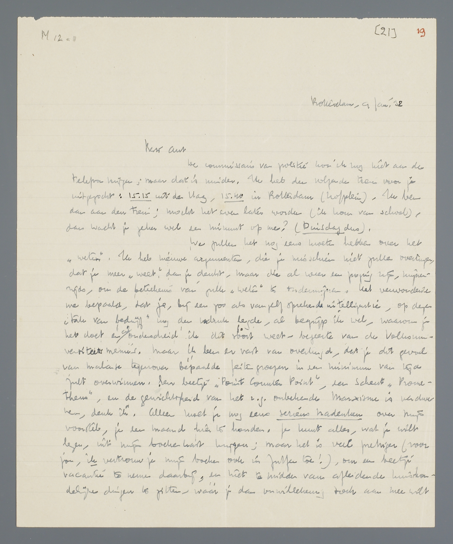 De commissaris van politie kon ik nog niet aan de telefoon krijgen; maar dat is minder. Ik heb den volgende trein voor je uitgezocht: 15.15 uit den Haag, 15.40 in Rotterdam (Hofplein). Ik ben dan aan den trein; mocht het even later worden (ik kom van school), dan wacht je zeker wel een minuut op me? (Dinsdag dus).