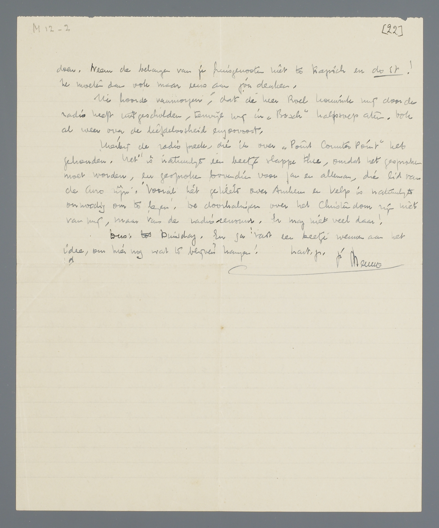 Hierbij de radio preek, die ik over ‘Point Counter Point’ heb gehouden. Het is natuurlijk een beetje slappe thee, omdat het gesproken moet worden, en gesproken bovendien voor Jan en alleman, die lid van de Avro zijn. Vooral het geklets over Arnhem en Velp is natuurlijk onnoodig om te lezen! De doorhalingen over het Christendom zijn niet van mij, maar van de radio-censuur. Er mag niet veel daar!