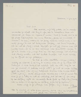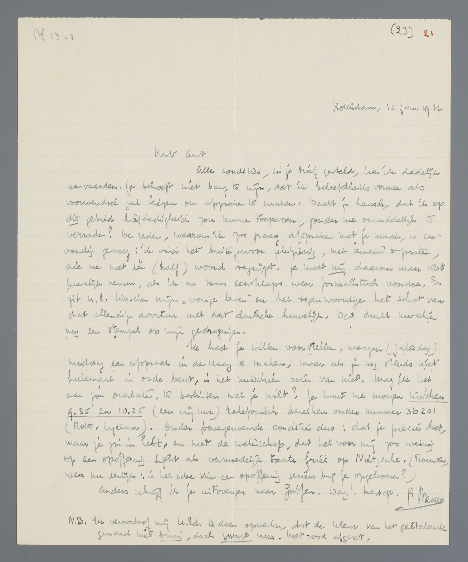 Ik had je willen voorstellen, morgen (Zaterdag) middag een afspraak in den Haag te maken; maar als je nog steeds niet heelemaal in orde bent, is het misschien beter van niet. Mag ik het aan jou overlaten, te beslissen wat je wilt? Je kunt me morgen tusschen 9.35 en 10.25 (een vrij uur) telefonisch bereiken onder nummer 36201 (Rott. Lyceum). Onder bovengenoemde condities dus: dat je precies doet, waar je zin in hebt, en met de wetenschap, dat het voor mij zoo weinig op een opoffering lijkt als vermoedelijk tante Griet op Nietzsche. (Trouwens, wees nu eerlijk: is het idee van een opoffering serieus bij je opgekomen?)